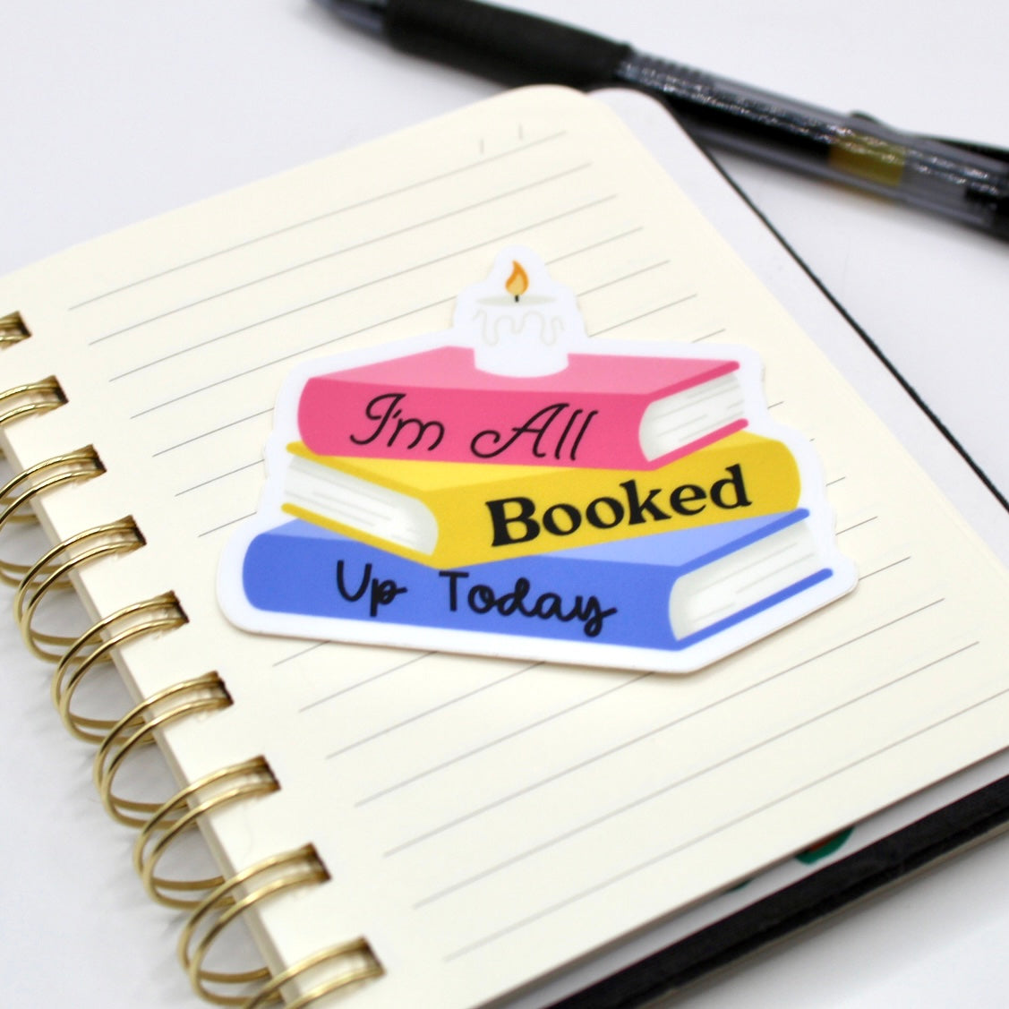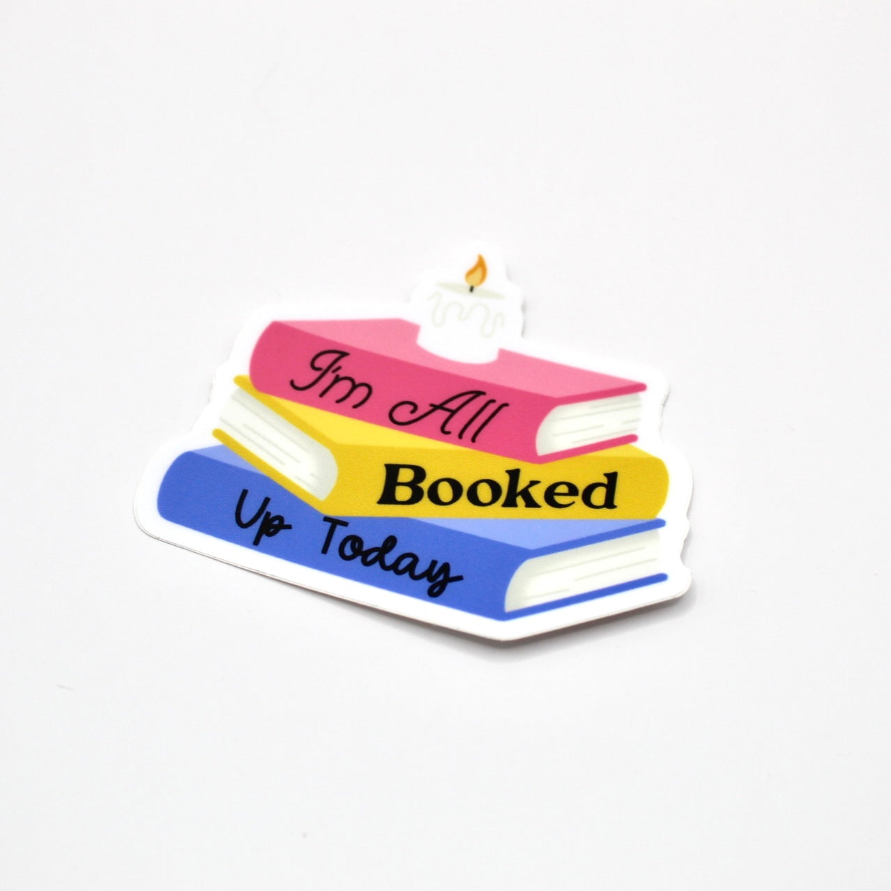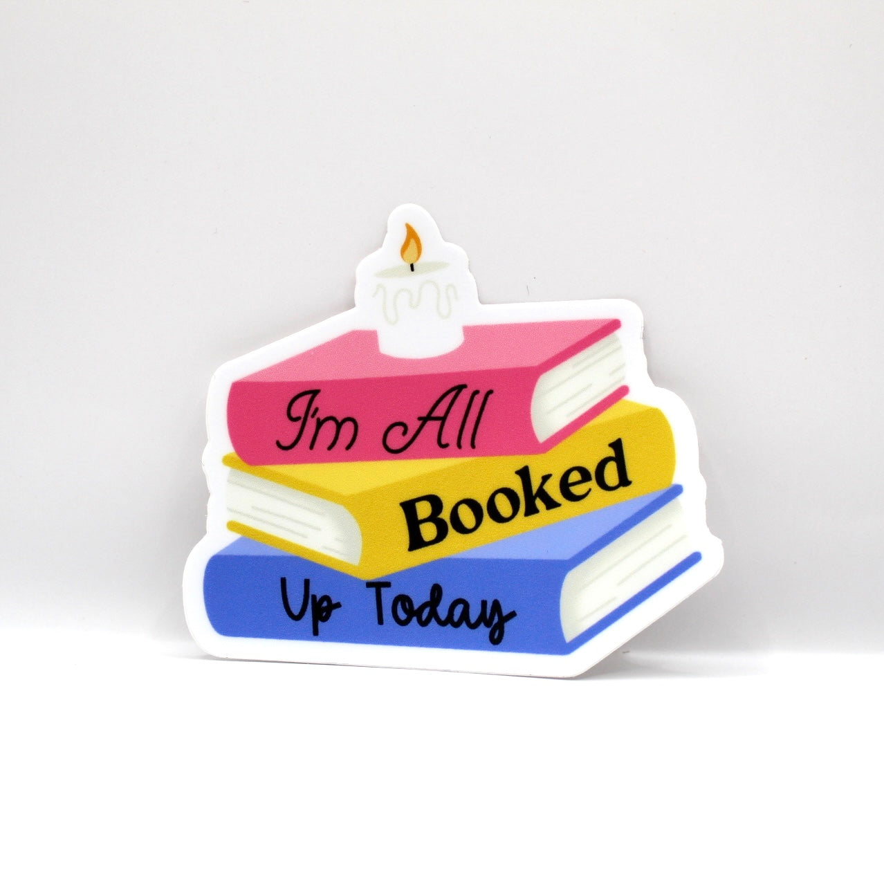 Add flair to daily life with this hand drawn vinyl sticker. With its durable design, its perfect for water bottles, laptops, and so much more! Just apply to any smooth surface. It features bright colors and a simple, clean outline. A stack of books that says "I'm all booked up today" because our TBR is way too long!