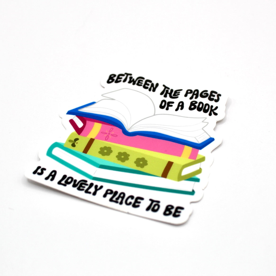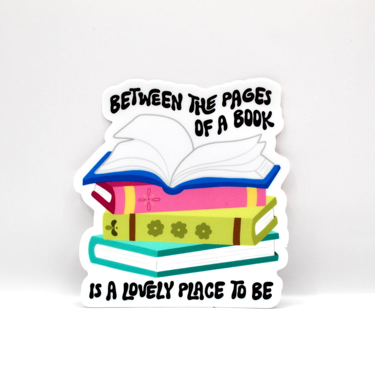 Add flair to daily life with this hand drawn vinyl sticker. With its durable design, its perfect for water bottles, laptops, and so much more! Just apply to any smooth surface. It features bright colors and a simple, clean outline. A stack of colorful books that says "Between the pages of a book is a lovely place to be".