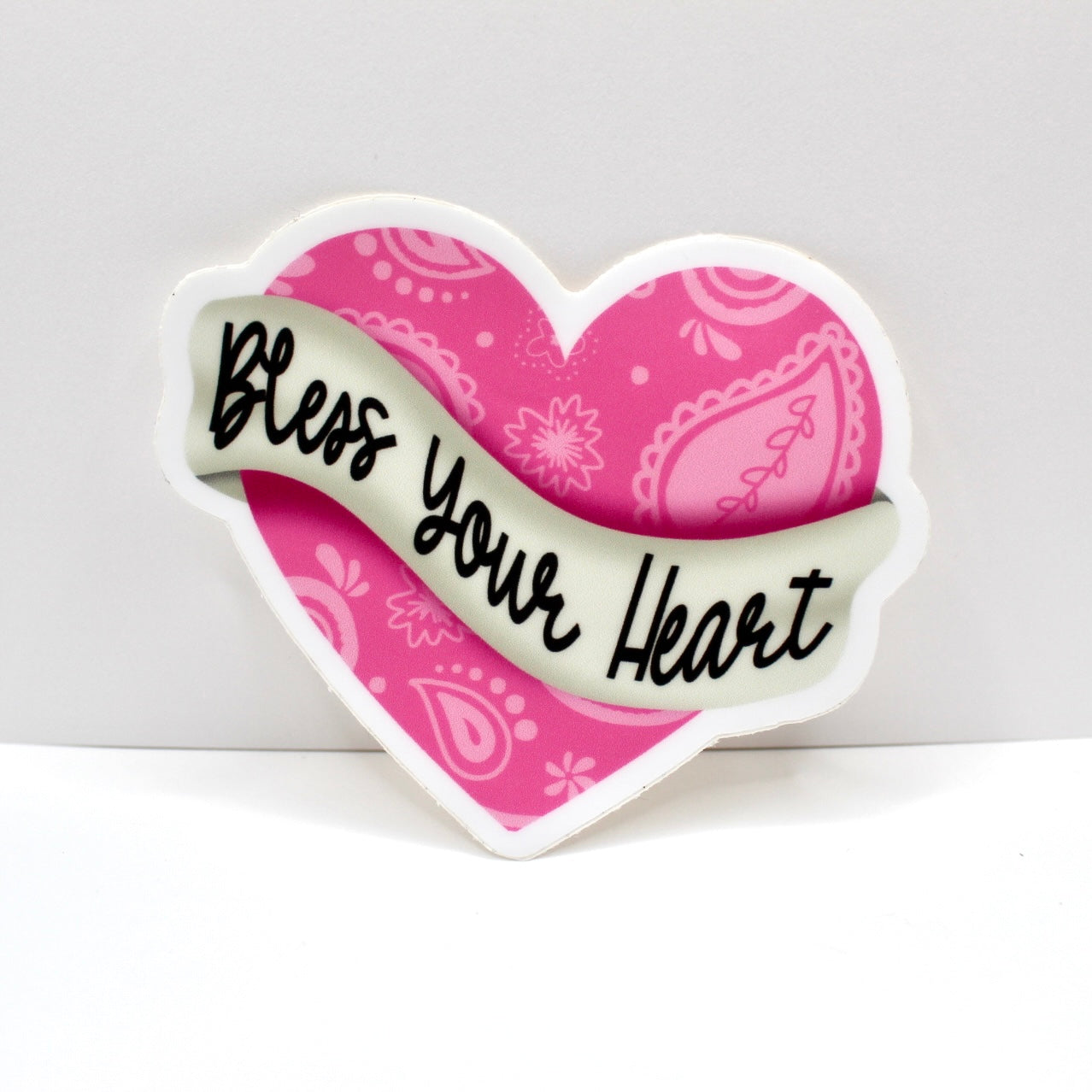 Add flair to daily life with this hand drawn vinyl sticker. With its durable design, its perfect for water bottles, laptops, and so much more! Just apply to any smooth surface. It features bright colors and a simple, clean outline. This sweet southern saying is stretched across a paisley heart.