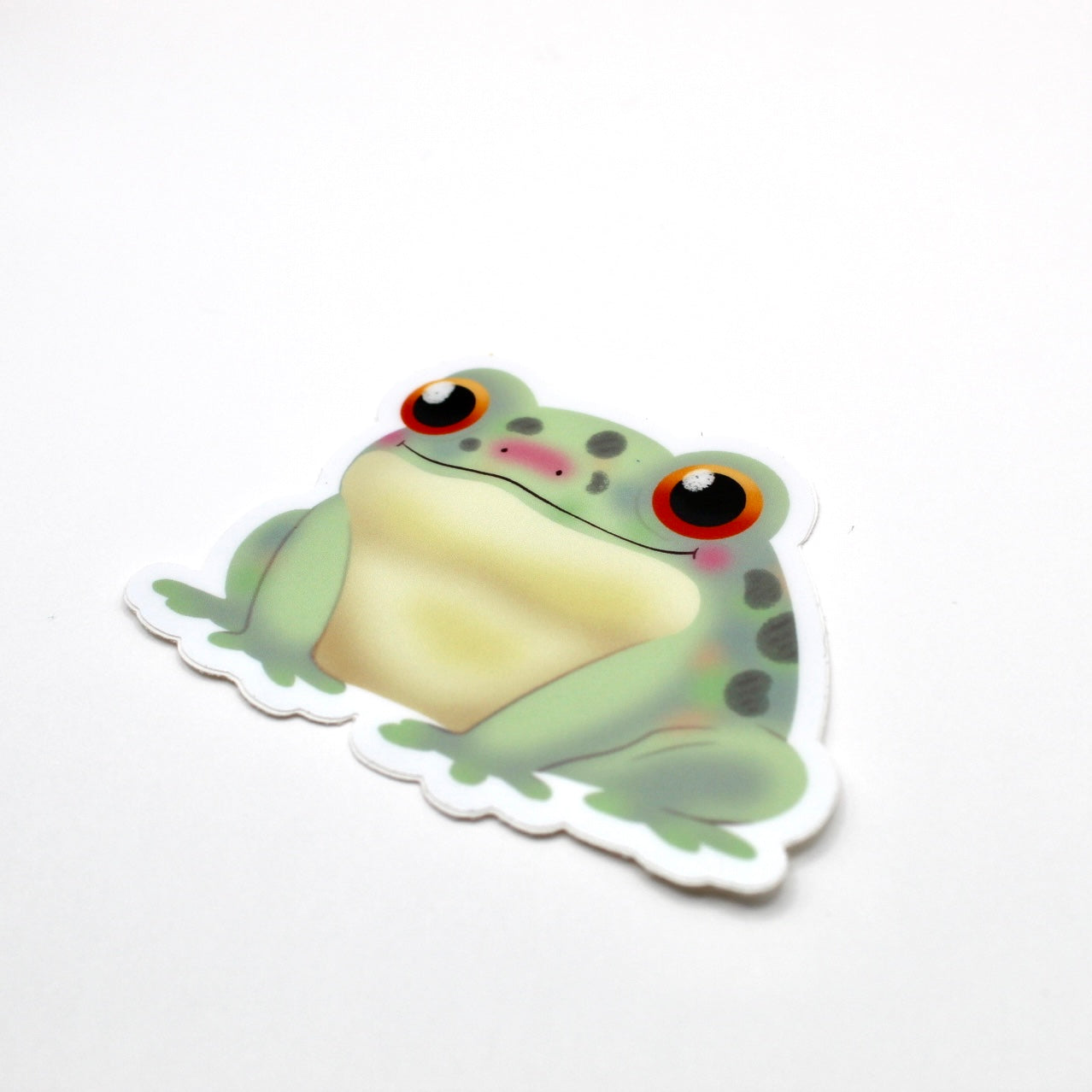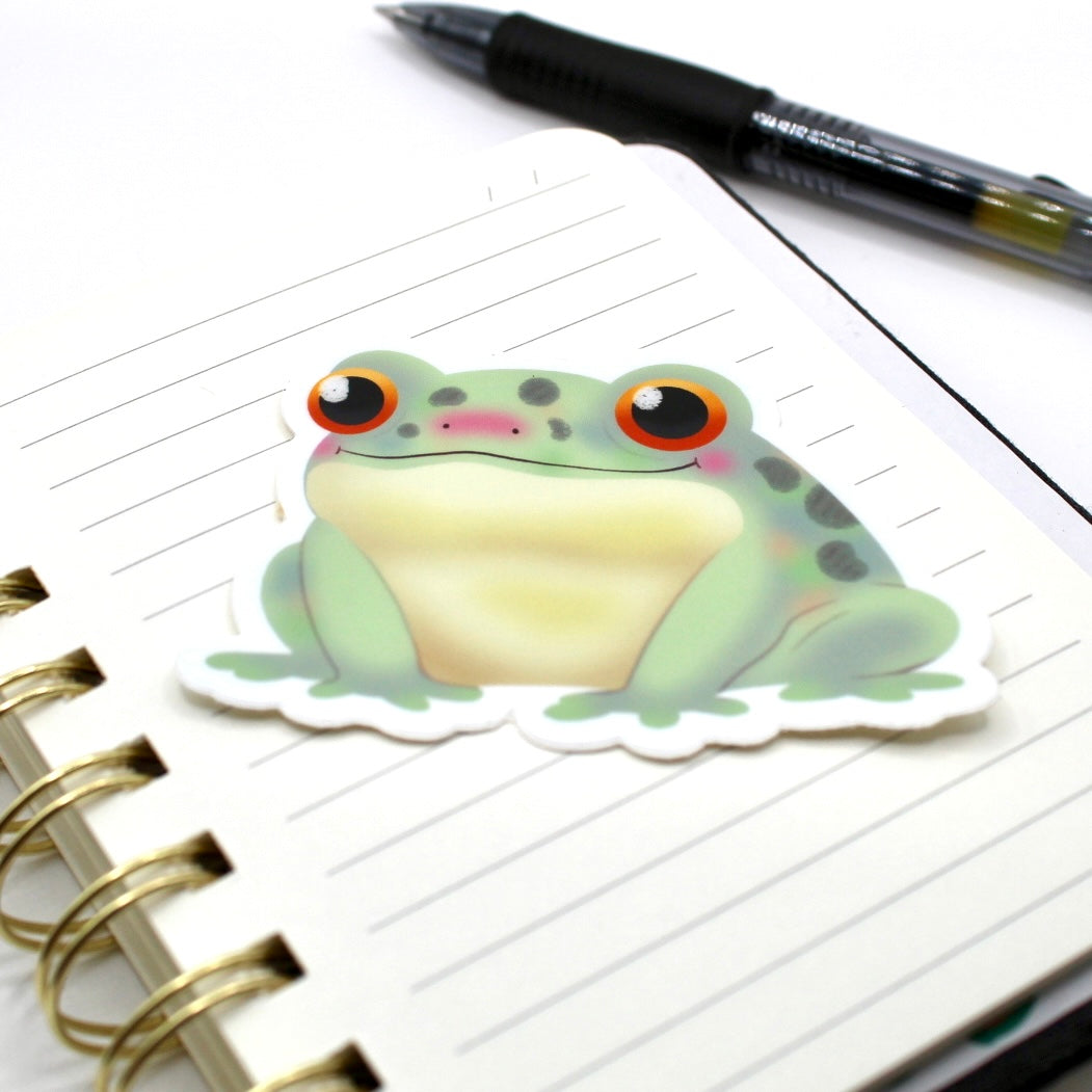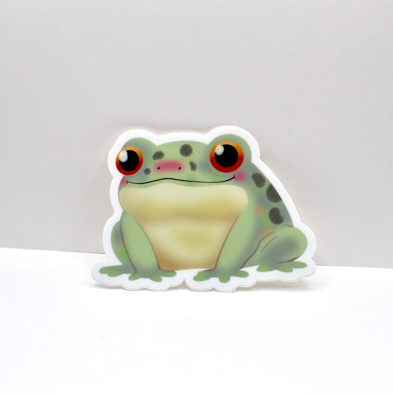 Add flair to daily life with this hand drawn vinyl sticker. With its durable design, its perfect for water bottles, laptops, and so much more! Just apply to any smooth surface. This sticker features an adorable frog.