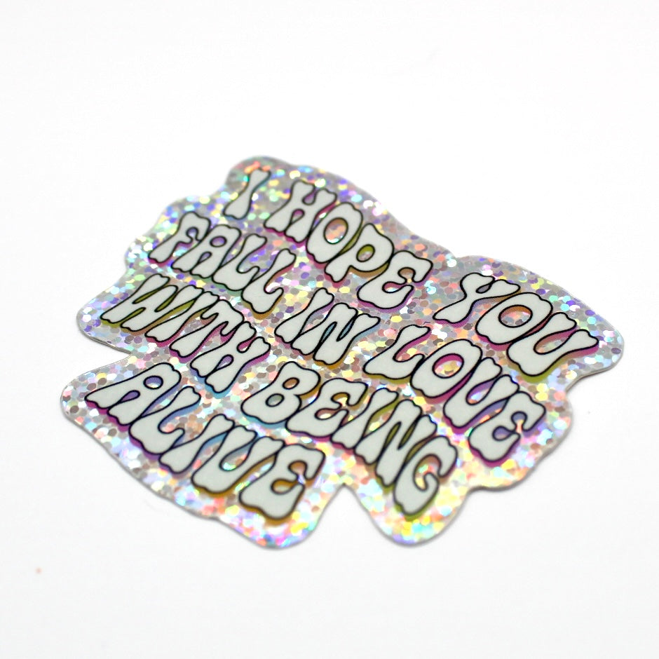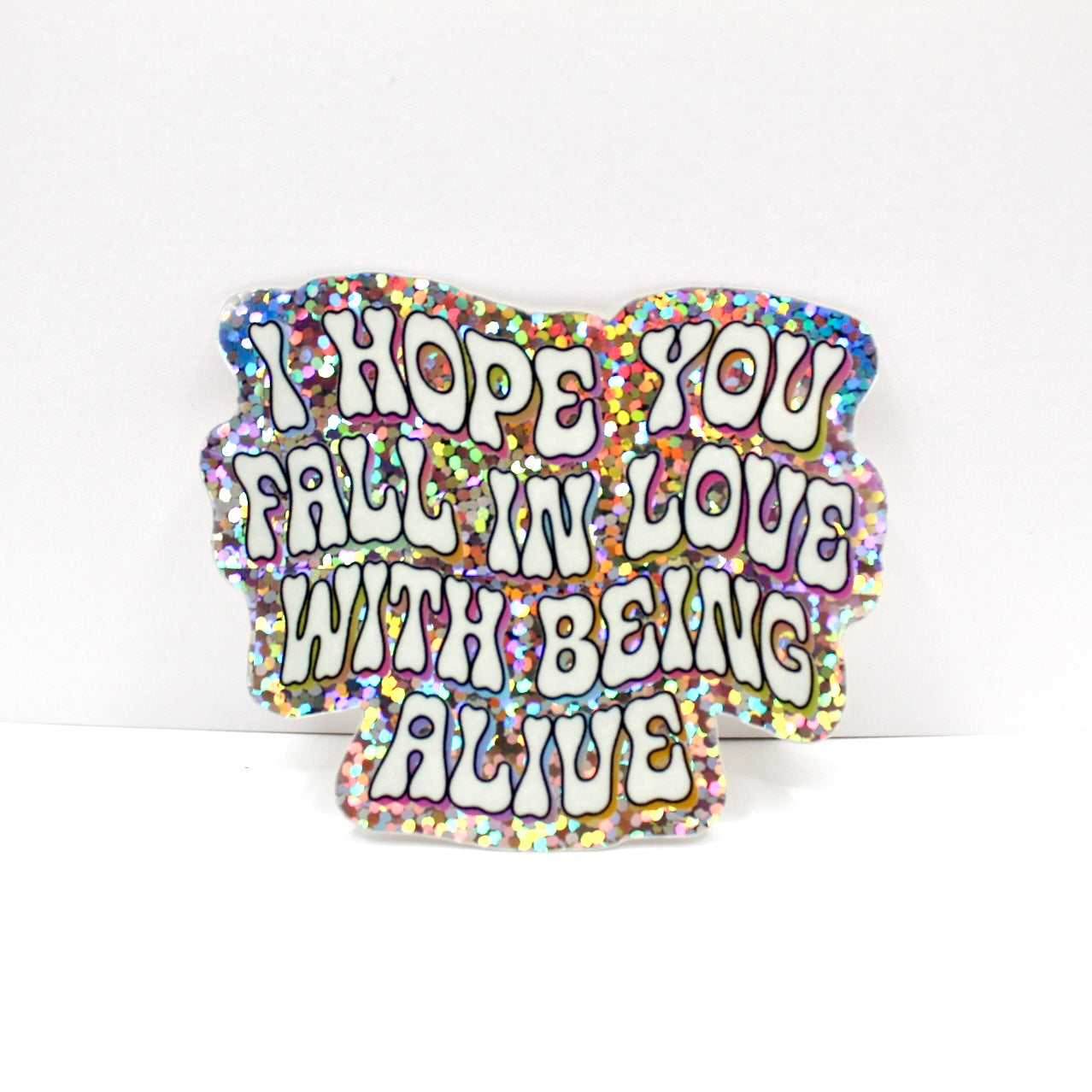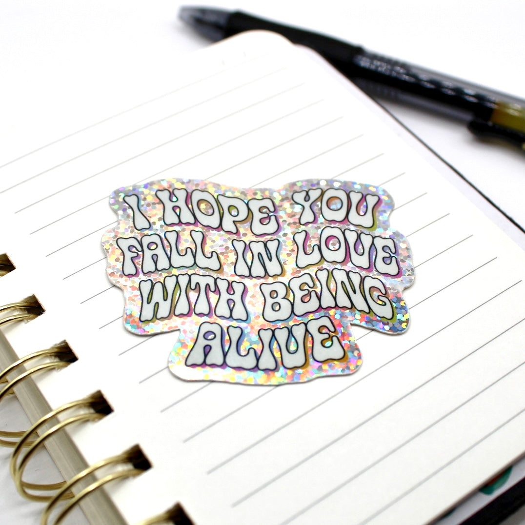 Add flair to daily life with this hand drawn vinyl sticker. With its durable design, its perfect for water bottles, laptops, and so much more! Just apply to any smooth surface. This sticker promotes mental health. It features a glitter background with the phrase "I Hope You Fall in Love with Being Alive".