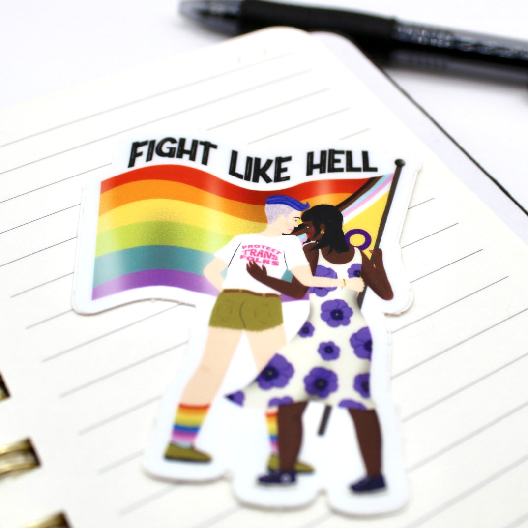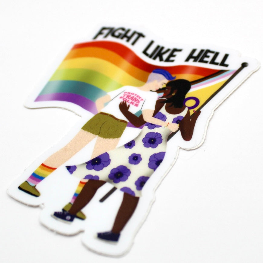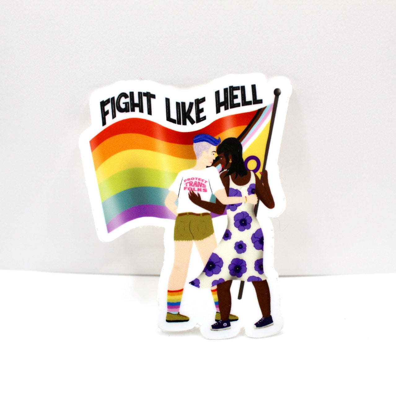 Add flair to daily life with this hand drawn vinyl sticker. With its durable design, its perfect for water bottles, laptops, and so much more! Just apply to any smooth surface. This sticker encourages others to "Fight Like Hell" for the LGBTQIA+ community. It features two people stating in front of the progress pride flag.