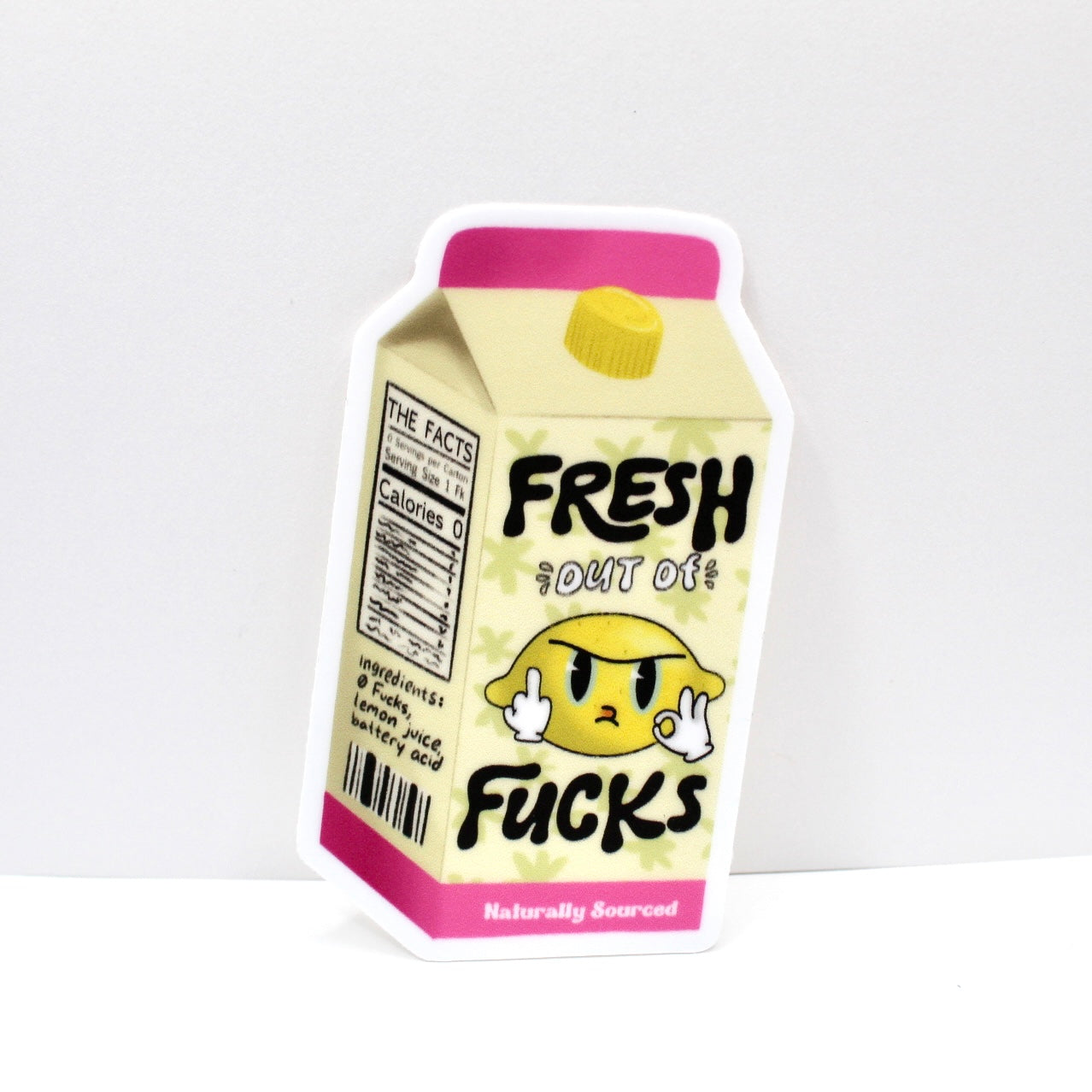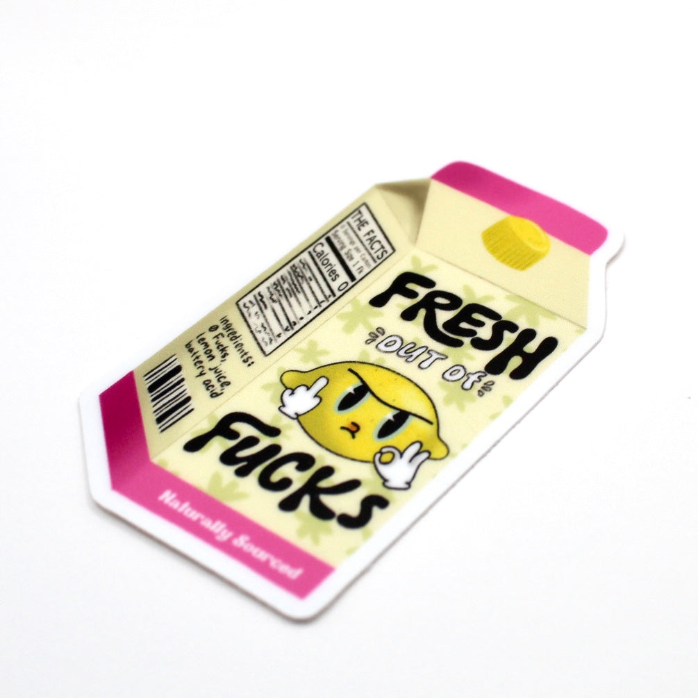 This hand drawn sticker is printed on high quality vinyl, making it waterproof and dishwasher safe! It features bright colors and a simple, clean outline. This sticker is in the shape of a carton of lemonade and says "Fresh out of Fucks" with a very sour lemon giving the bird.