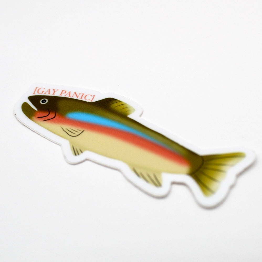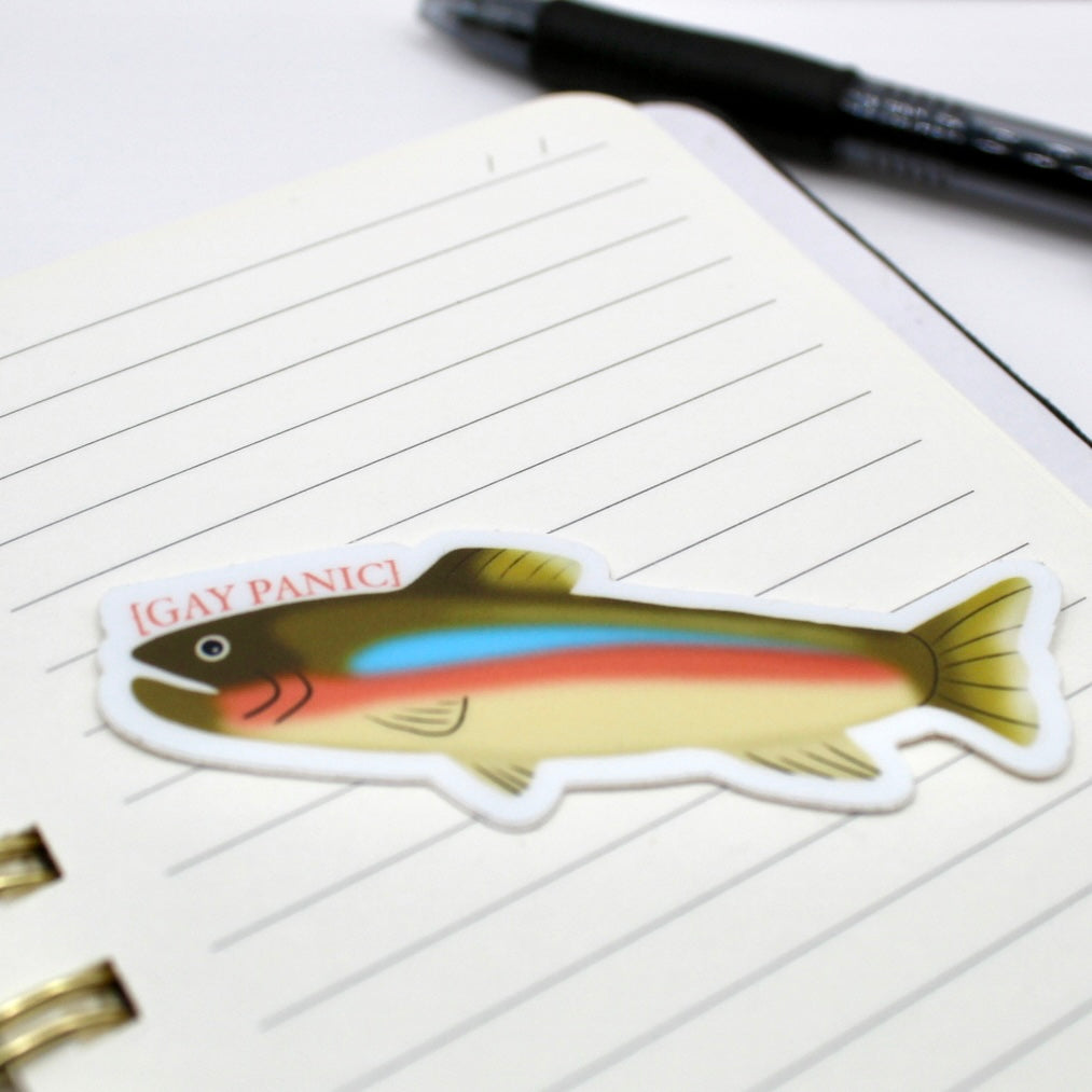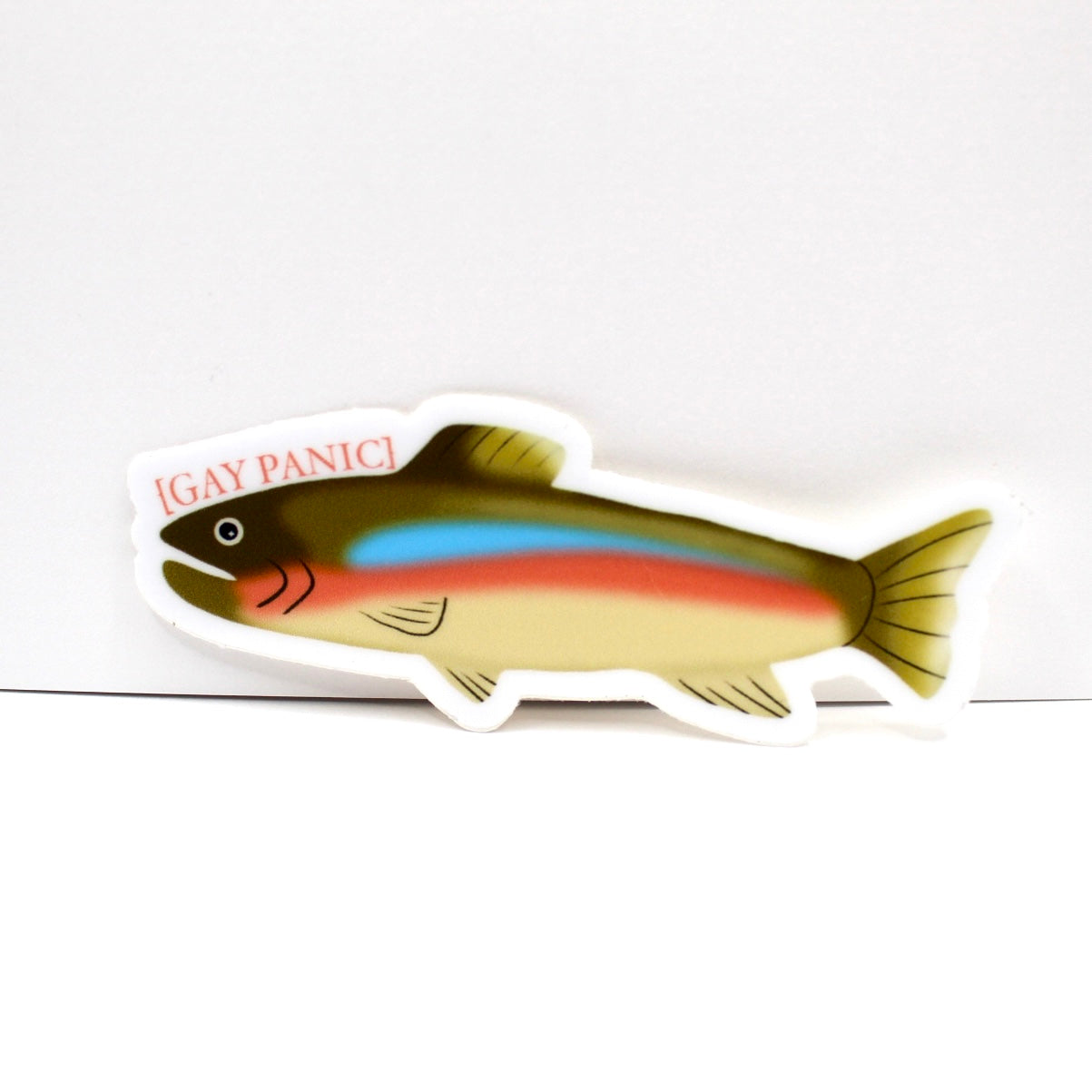 Add flair to daily life with this hand drawn vinyl sticker. With its durable design, its perfect for water bottles, laptops, and so much more! Just apply to any smooth surface. This sticker is a part of our Pride collection and features a rainbow trout that says "[gay panic]" above its head.