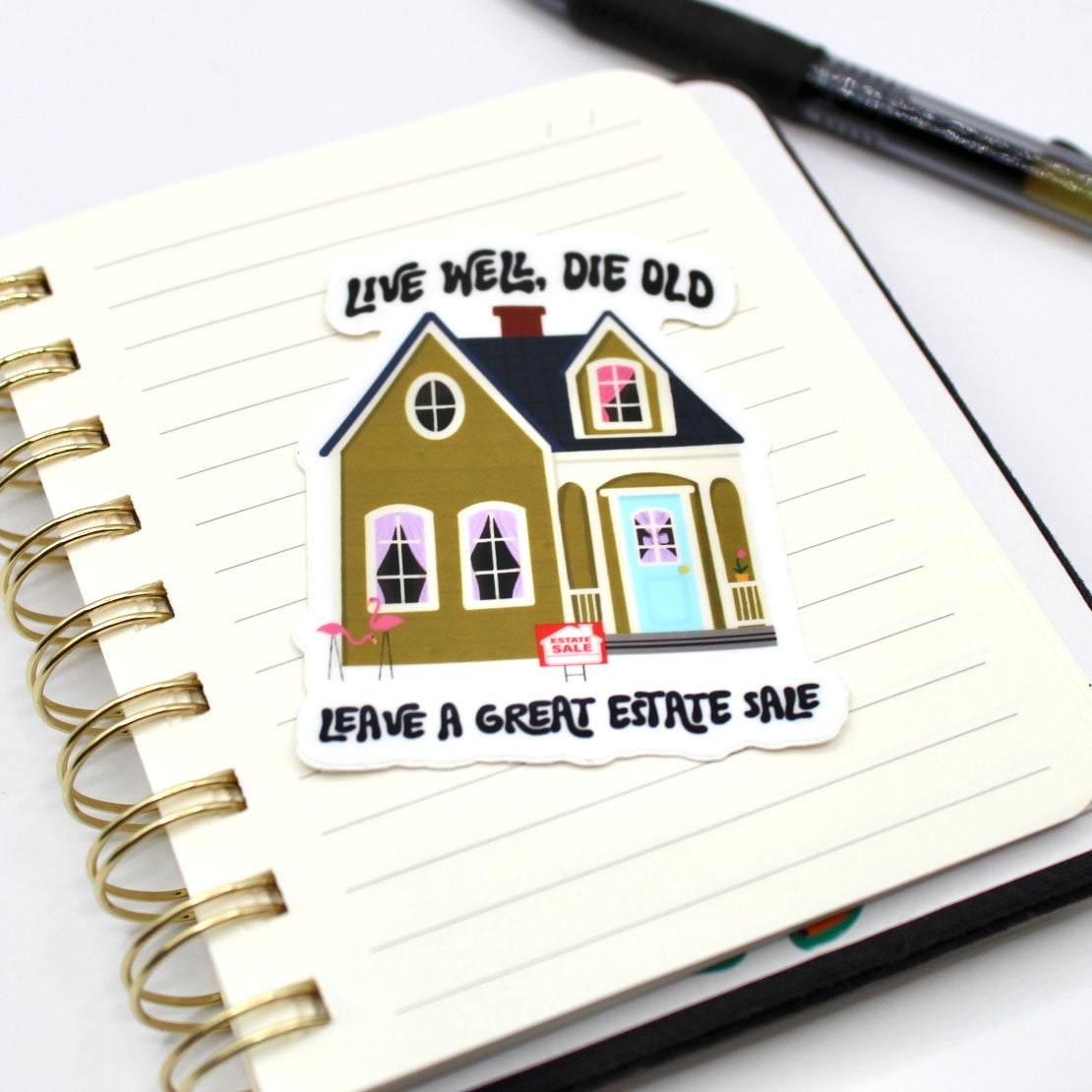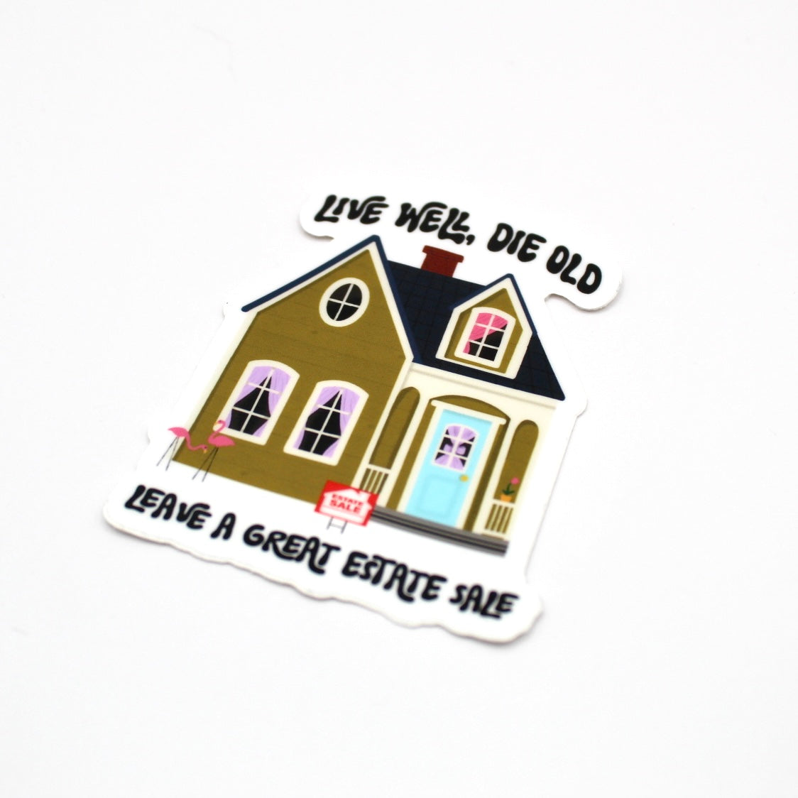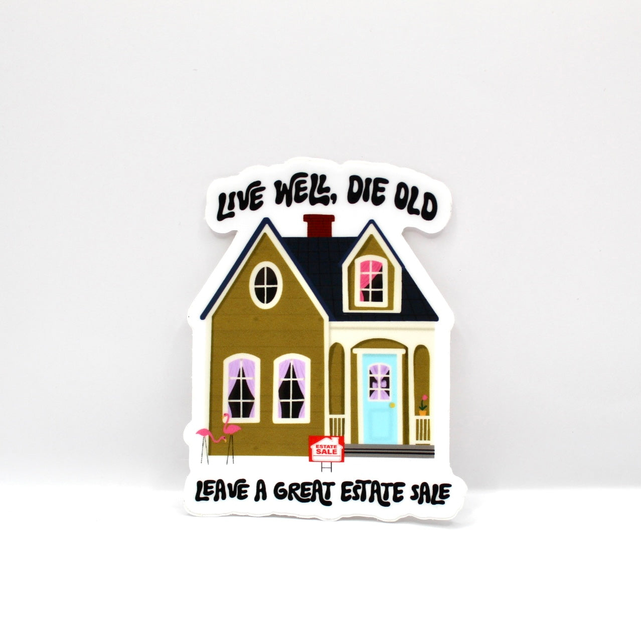 Add flair to daily life with this hand drawn vinyl sticker. With its durable design, its perfect for water bottles, laptops, and so much more! Just apply to any smooth surface. It features bright colors and a simple, clean outline. "Live well, die old, and leave a great estate sale" is the best life advice out there.
