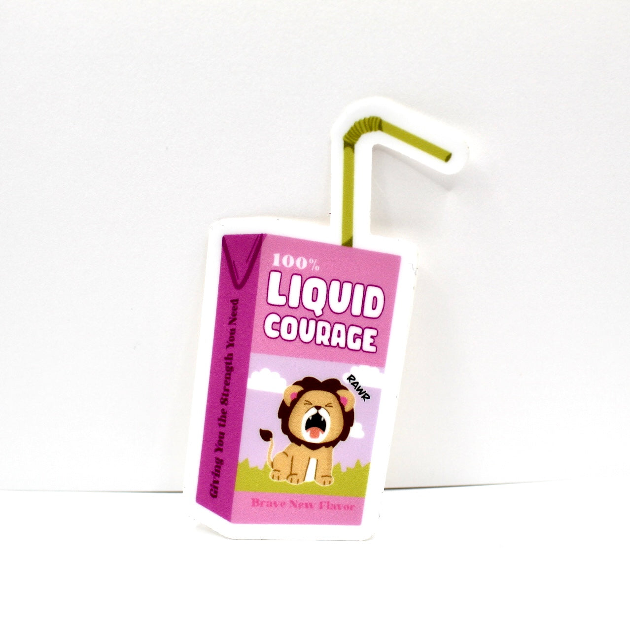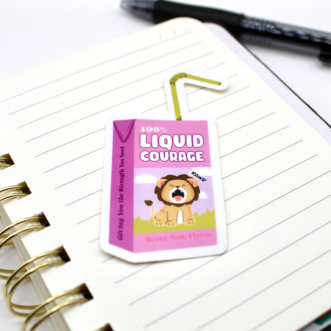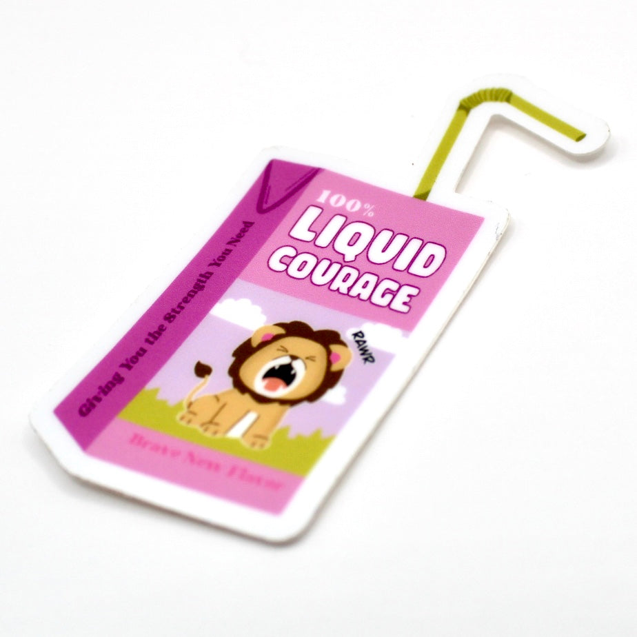 Add flair to daily life with this hand drawn vinyl sticker. With its durable design, its perfect for water bottles, laptops, and so much more! Just apply to any smooth surface. his sticker features a courageous baby lion on a juice box that says "Liquid Courage".