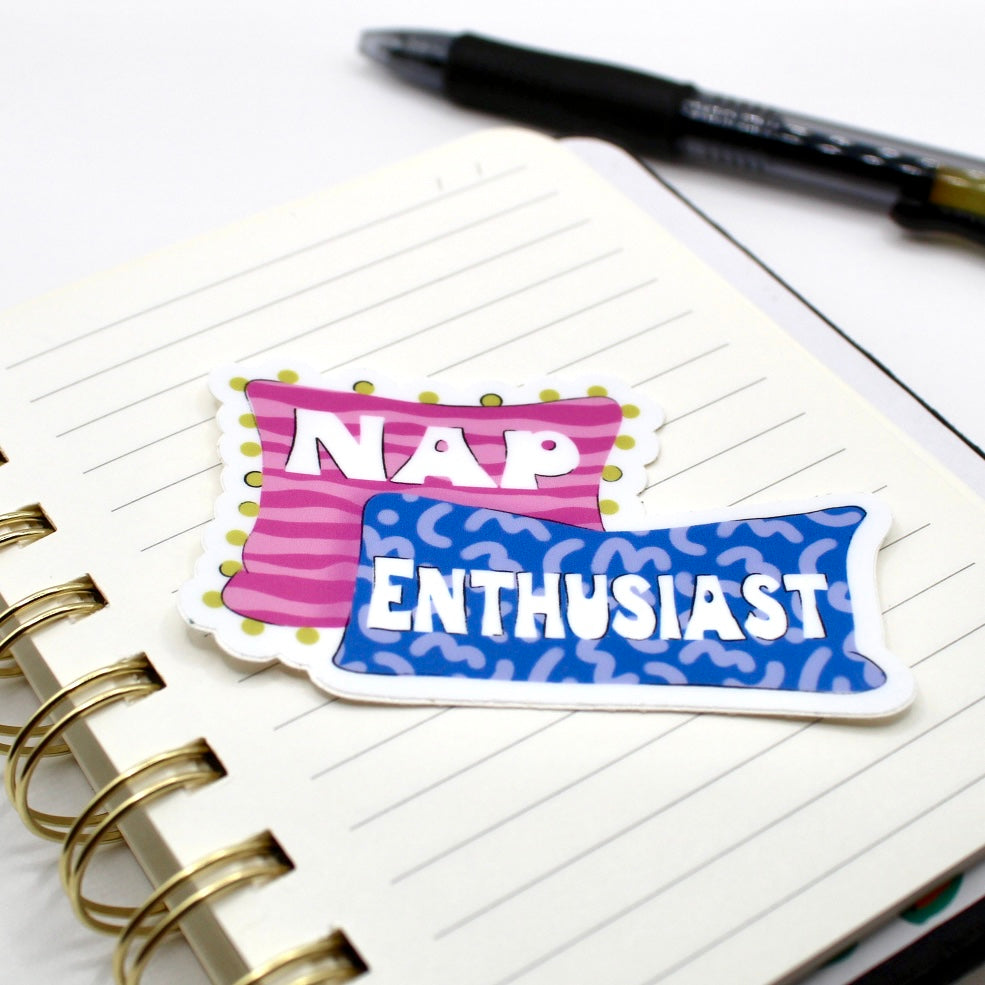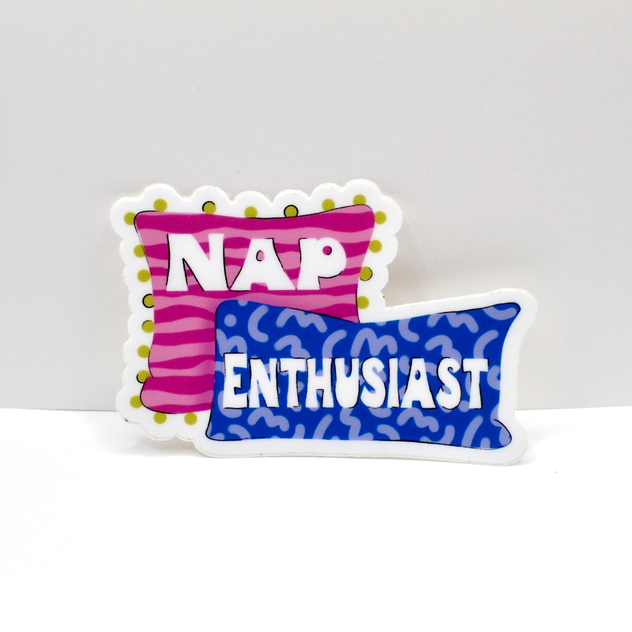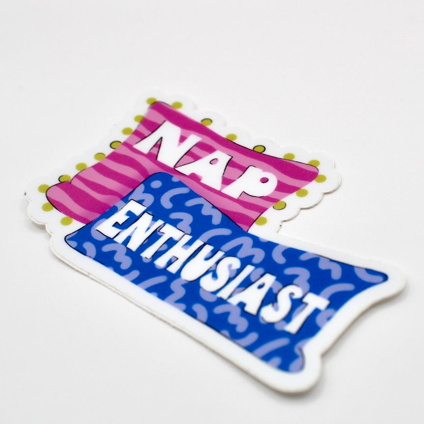 Add flair to daily life with this hand drawn vinyl sticker. With its durable design, its perfect for water bottles, laptops, and so much more! Just apply to any smooth surface. It features bright colors and a simple, clean outline. This sticker has two funky pillows and says "Nap Enthusiast".