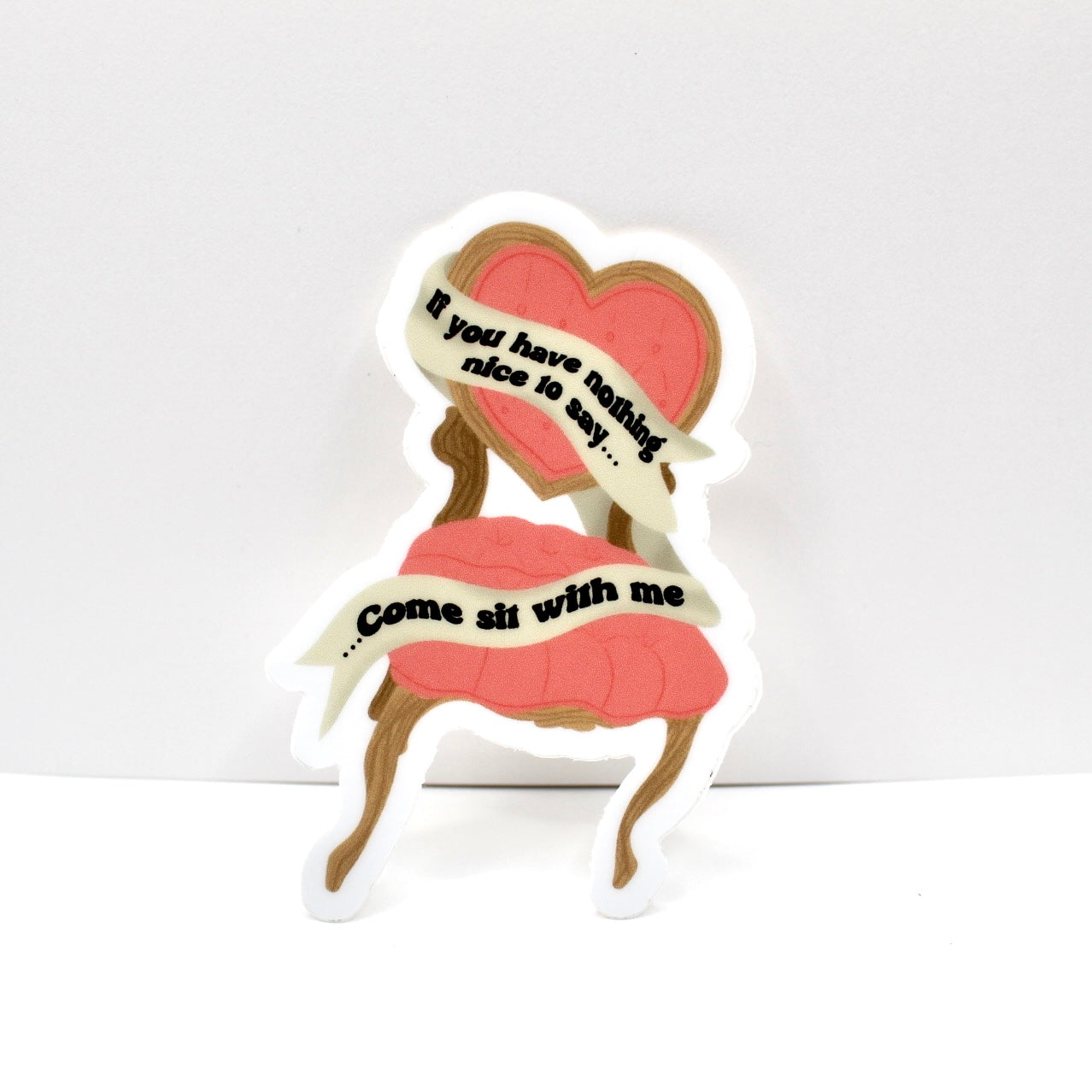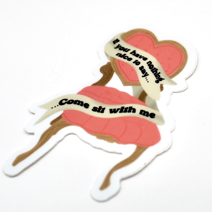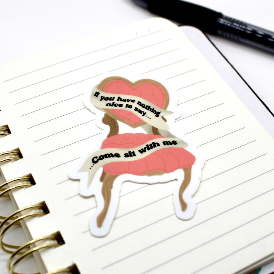 Add flair to daily life with this hand drawn vinyl sticker. With its durable design, its perfect for water bottles, laptops, and so much more! Just apply to any smooth surface. This sassy sticker features an image of a heart shaped chair and says "If you have nothing nice to say, come sit with me". Its perfect for the gossip queen in your life.