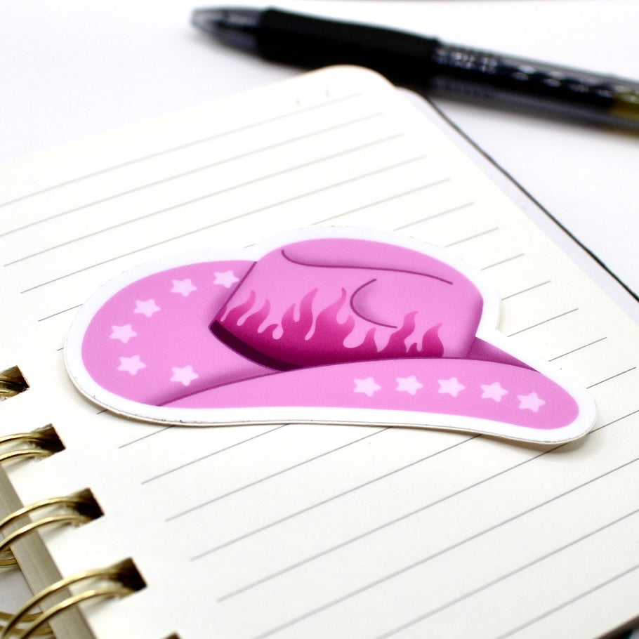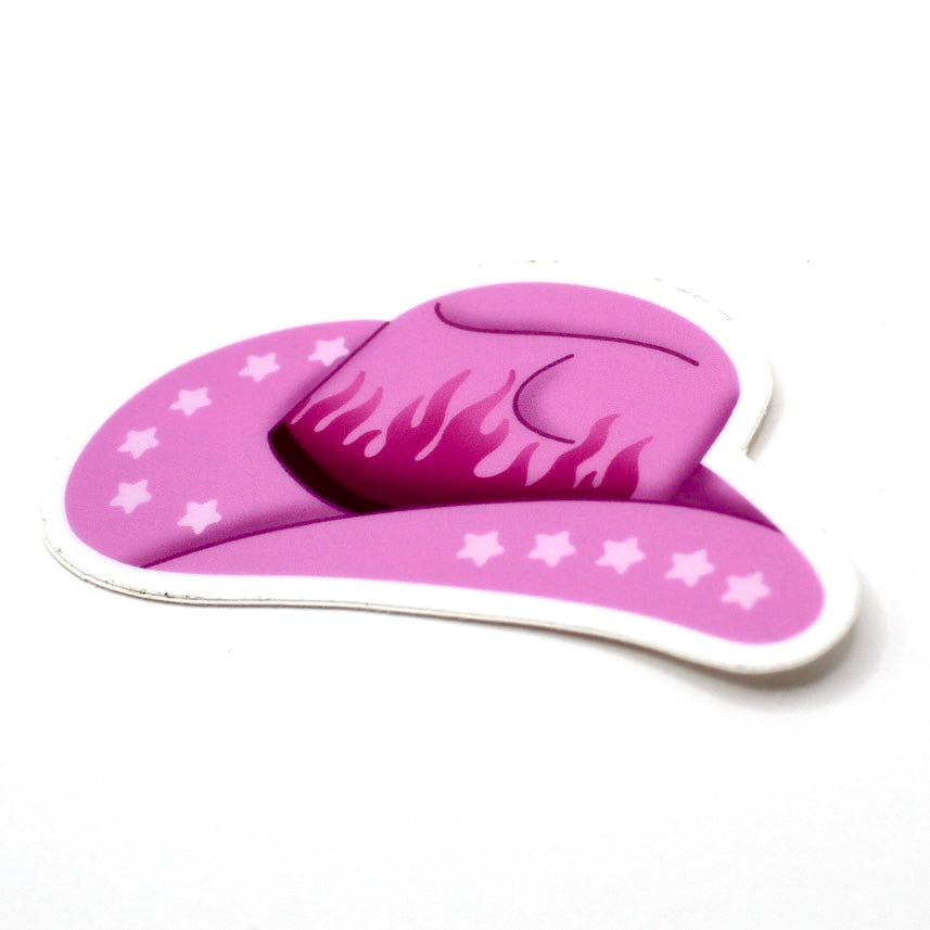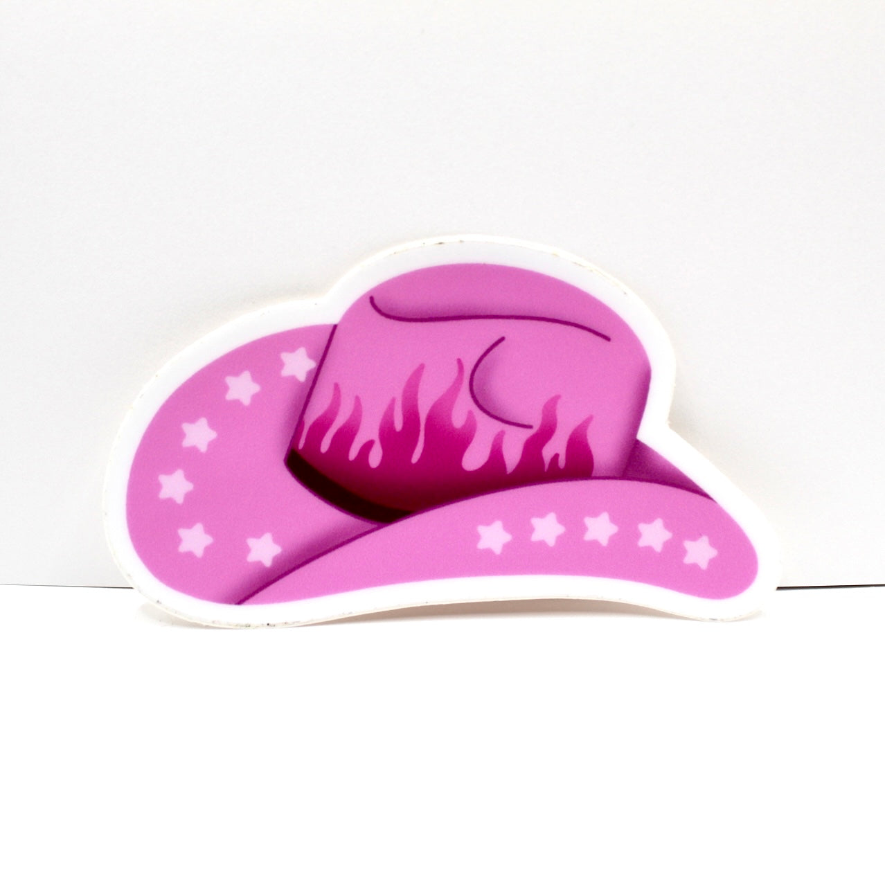 Add flair to daily life with this hand drawn vinyl sticker. With its durable design, its perfect for water bottles, laptops, and so much more! Just apply to any smooth surface. This sticker has a bold pink cowboy hat with flames and stars.