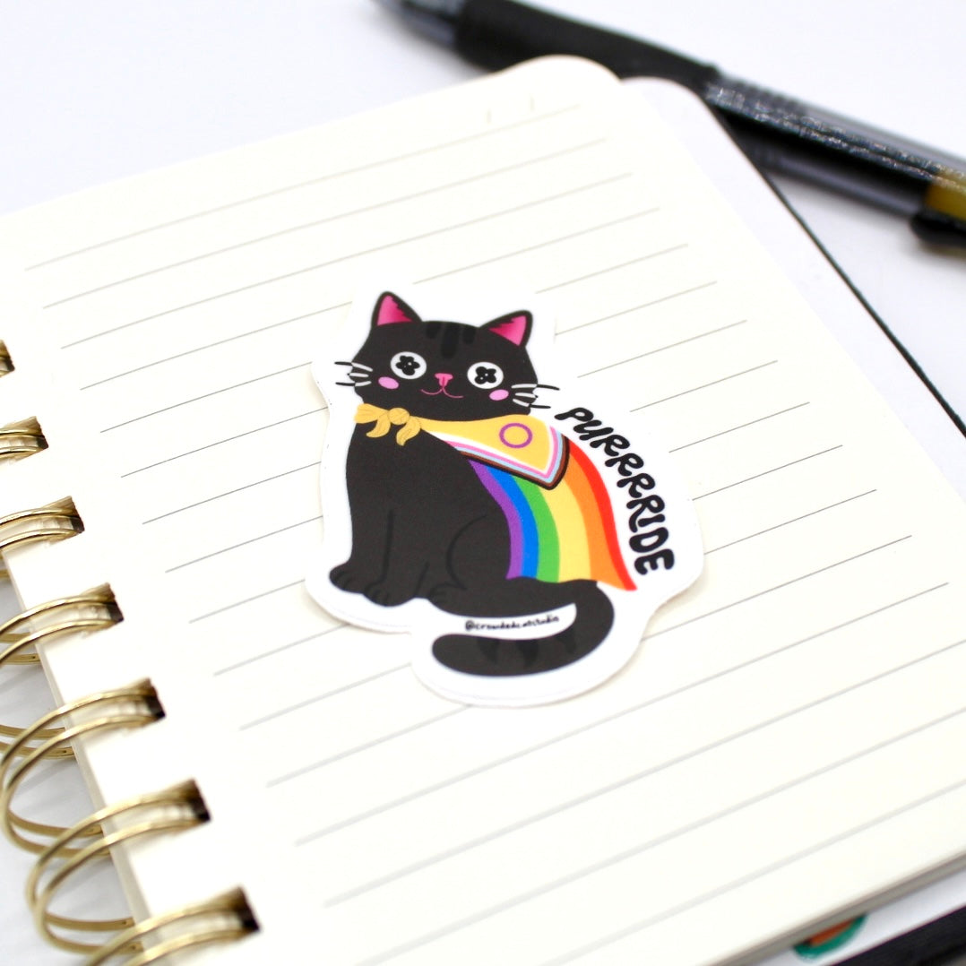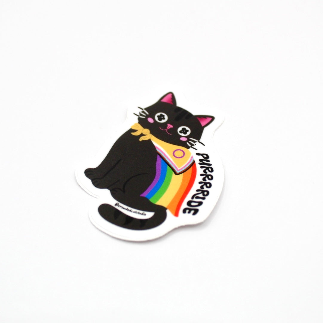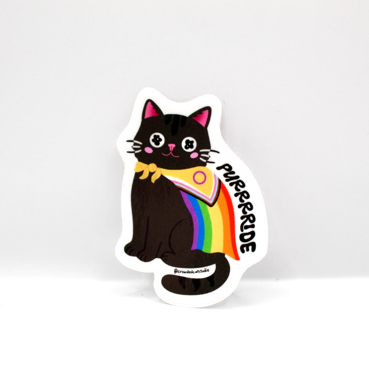 Add flair to daily life with this hand drawn vinyl sticker. With its durable design, its perfect for water bottles, laptops, and so much more! Just apply to any smooth surface. It features bright colors and a simple, clean outline. This black cat is full of purrrride and is wearing the progress flag as a cape!