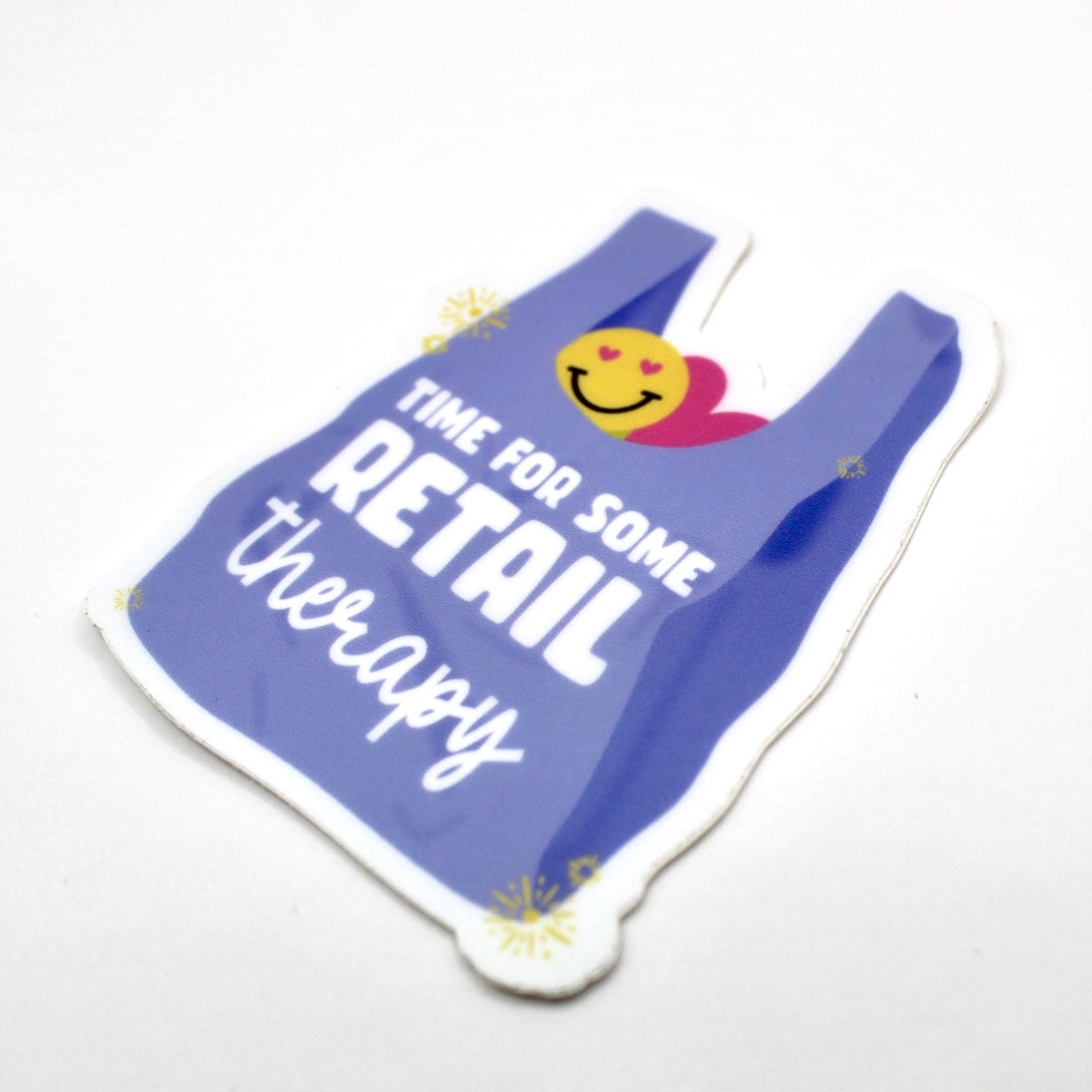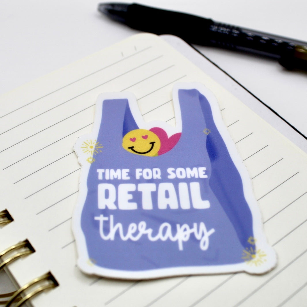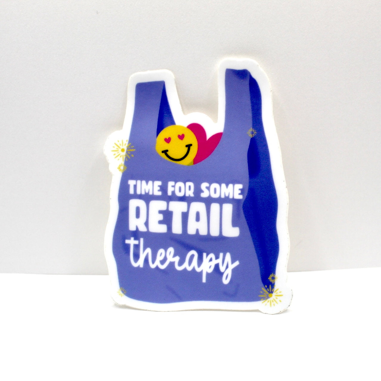 Add flair to daily life with this hand drawn vinyl sticker. With its durable design, its perfect for water bottles, laptops, and so much more! Just apply to any smooth surface. This sticker says "Its Time for Some Retail Therapy" and is perfect for avid shoppers.