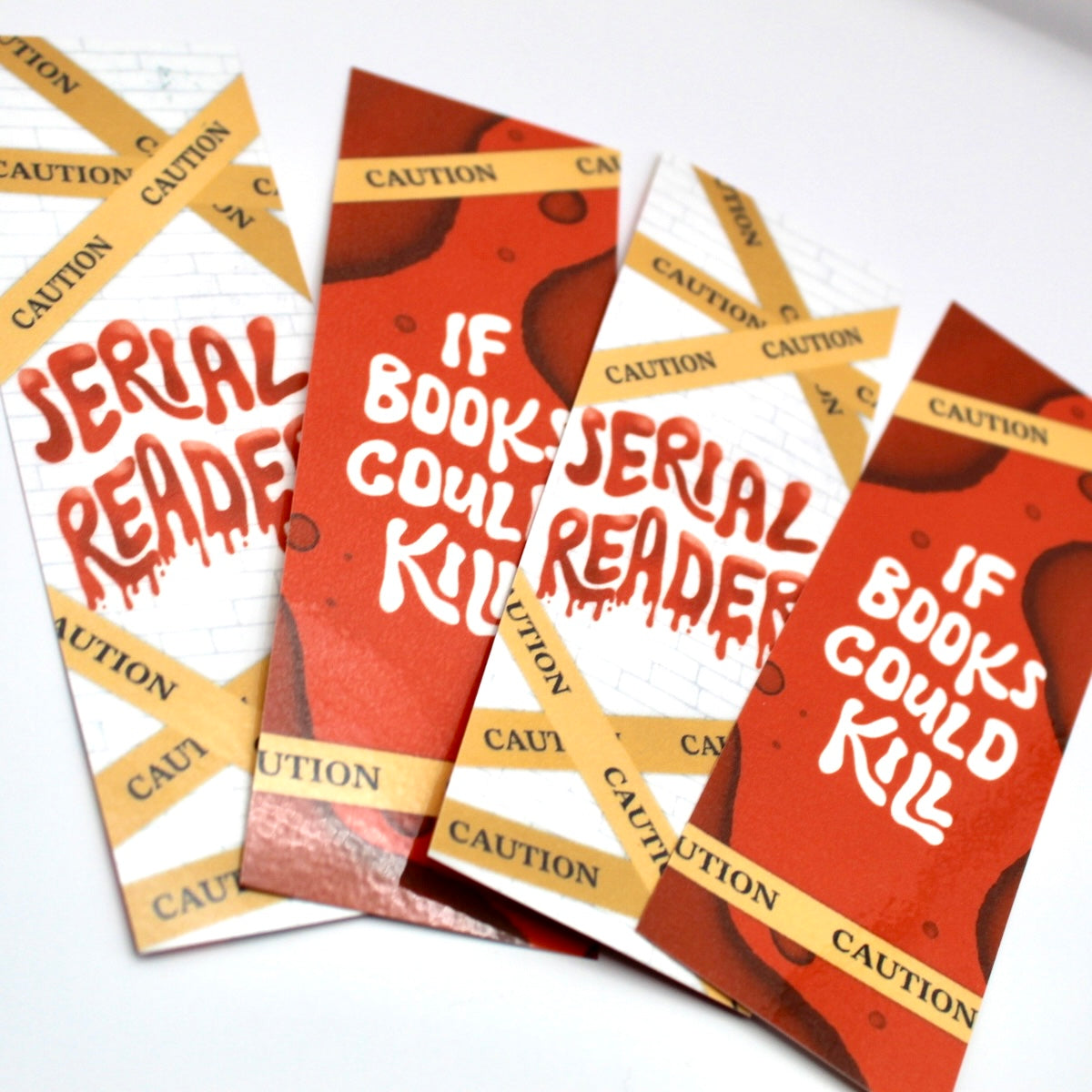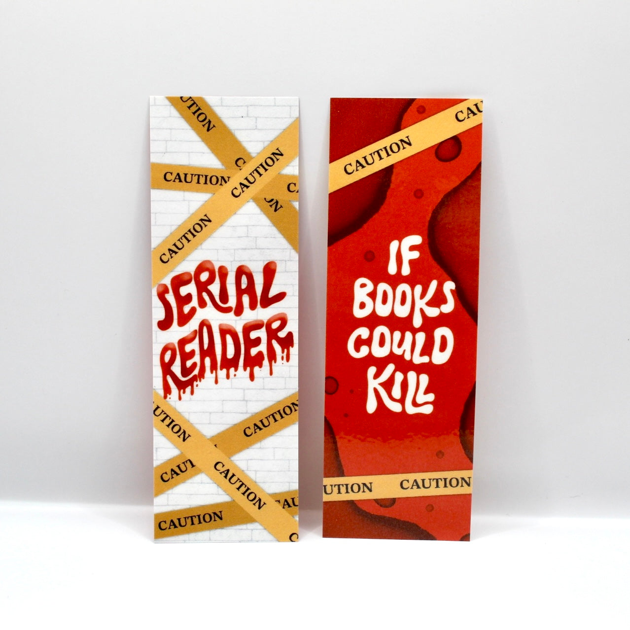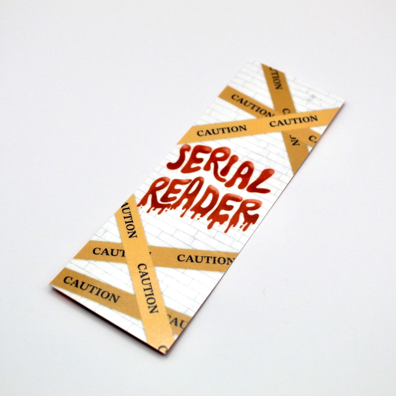 This funny bookmark features caution tape and a bloody font that says “Serial Reader” on the front side and the quote "If Books Could Kill" on the backside. It is thick and durable due to being made on heavy glitter cardstock and laminated.