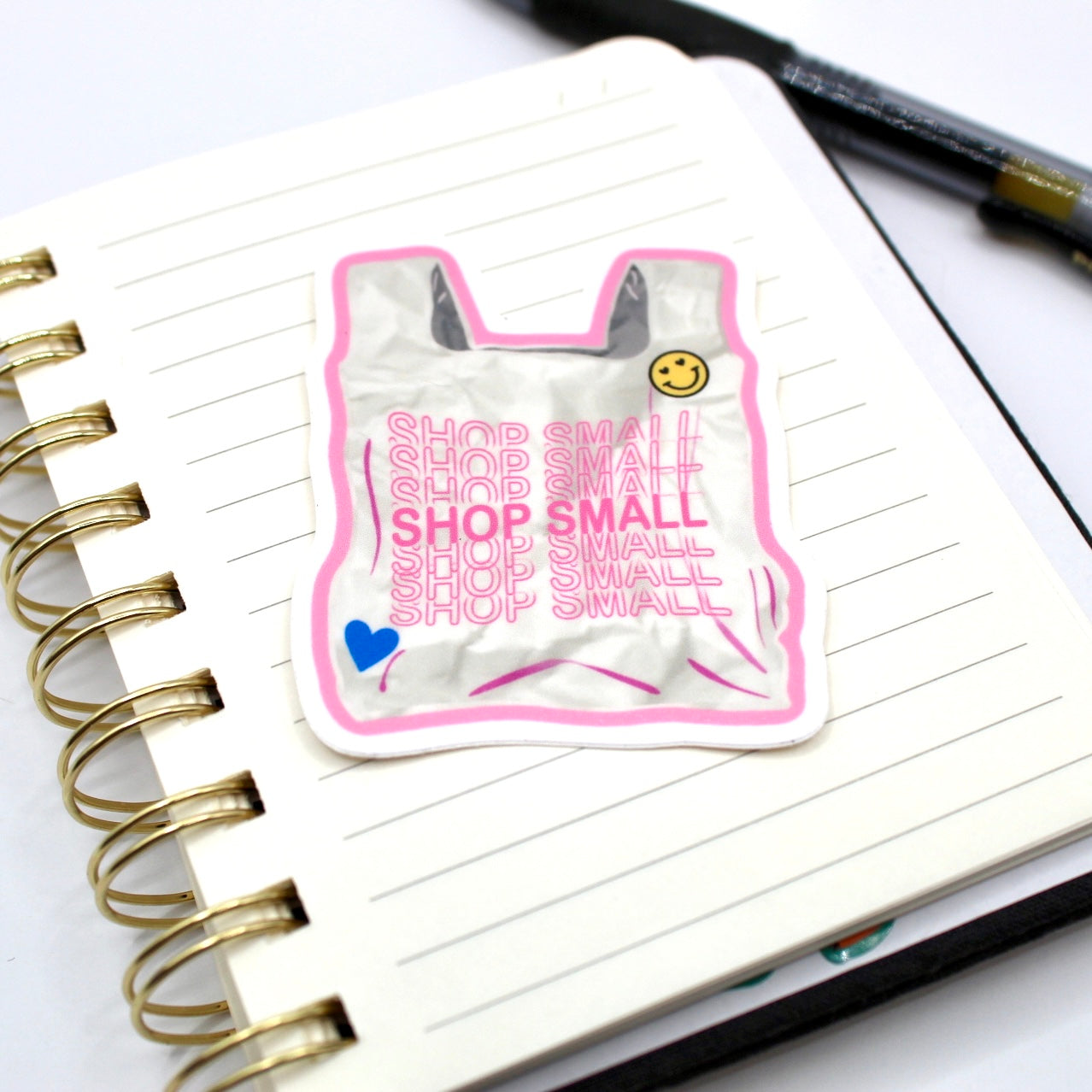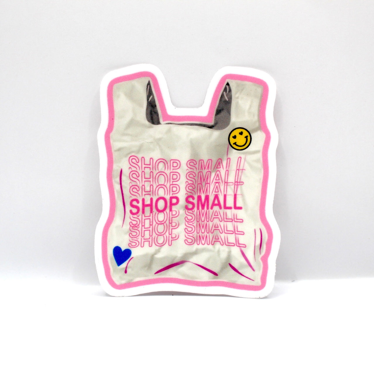 Add flair to daily life with this hand drawn vinyl sticker. With its durable design, its perfect for water bottles, laptops, and so much more! Just apply to any smooth surface. It features bright colors and a simple, clean outline. A cute shopping bag that says "Shop Small" and features two stickers on it.
