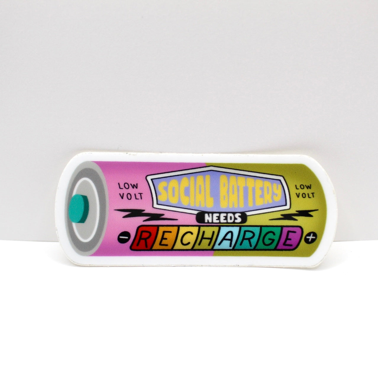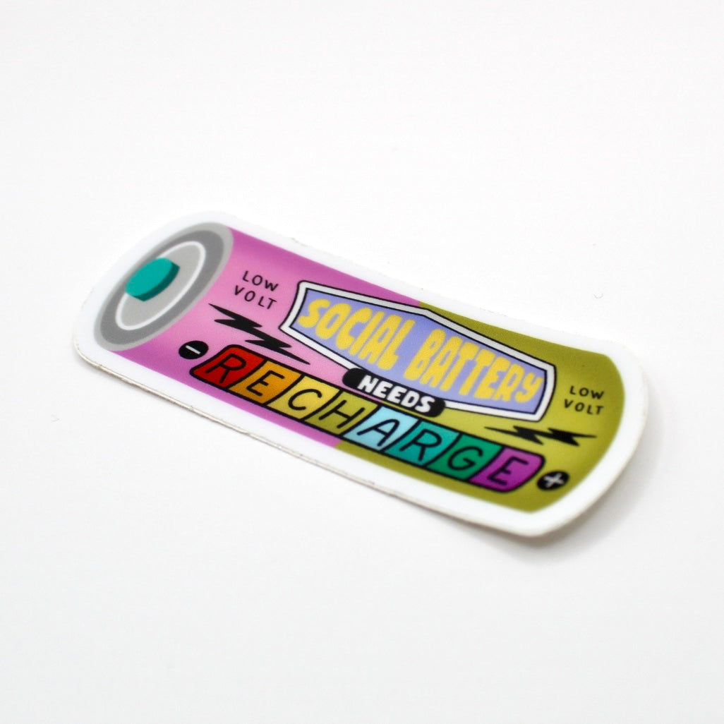 Add flair to daily life with this hand drawn vinyl sticker. With its durable design, its perfect for water bottles, laptops, and so much more! Just apply to any smooth surface. This sticker is a battery design that says "Social Battery Needs Recharge" and is perfect for introverts.