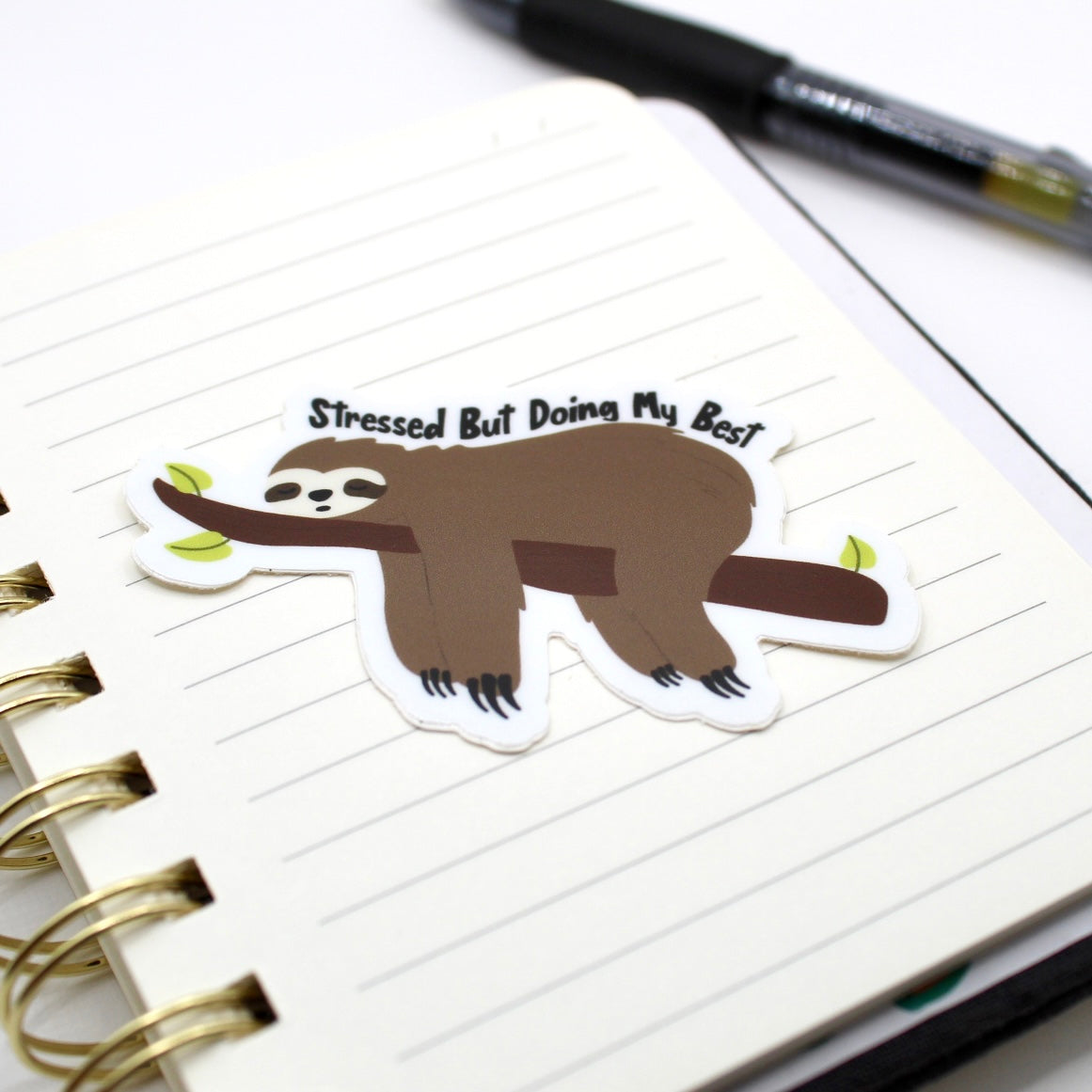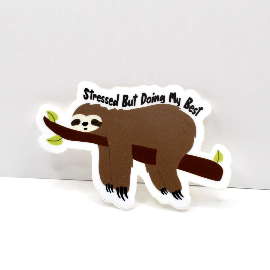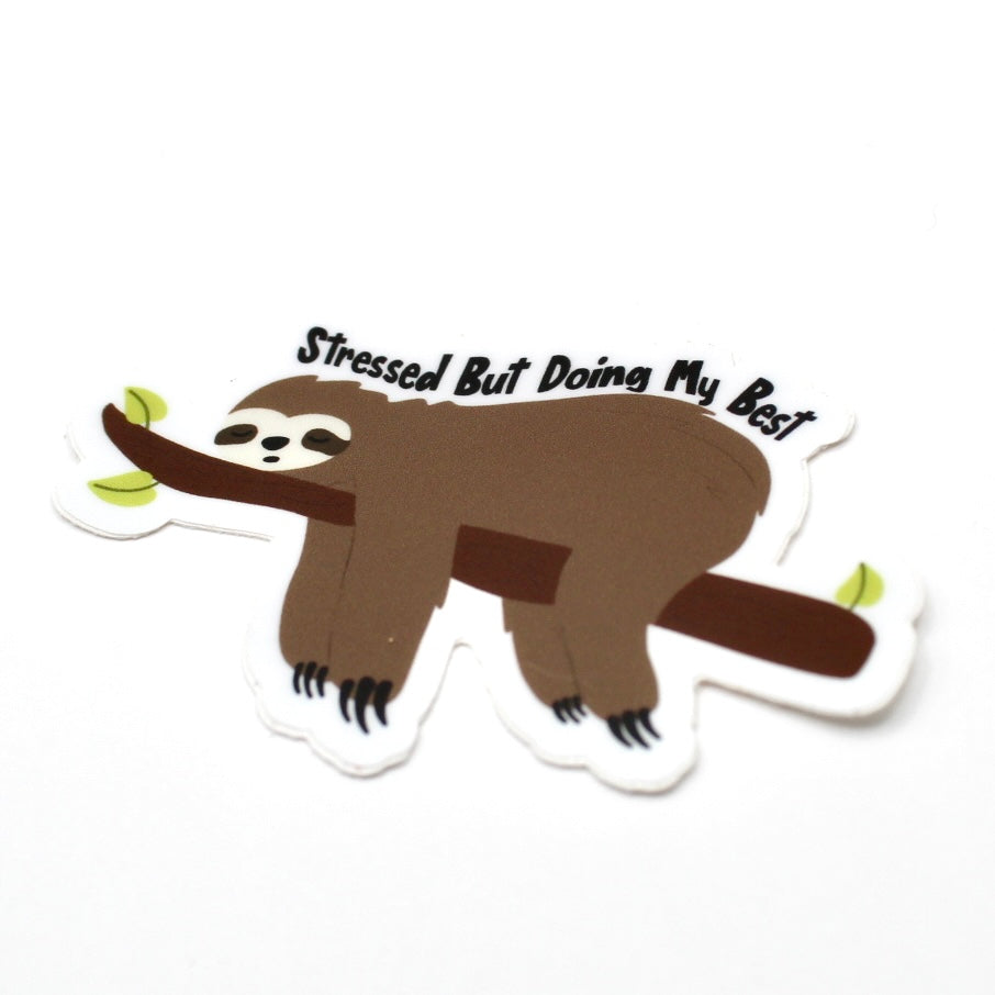 Add flair to daily life with this hand drawn vinyl sticker. With its durable design, its perfect for water bottles, laptops, and so much more! Just apply to any smooth surface. It features bright colors and a simple, clean outline. This sticker has a sleepy sloth and says "Stressed but doing my best".