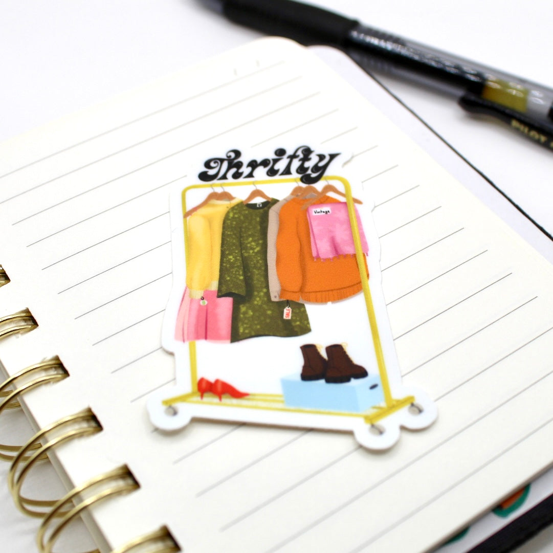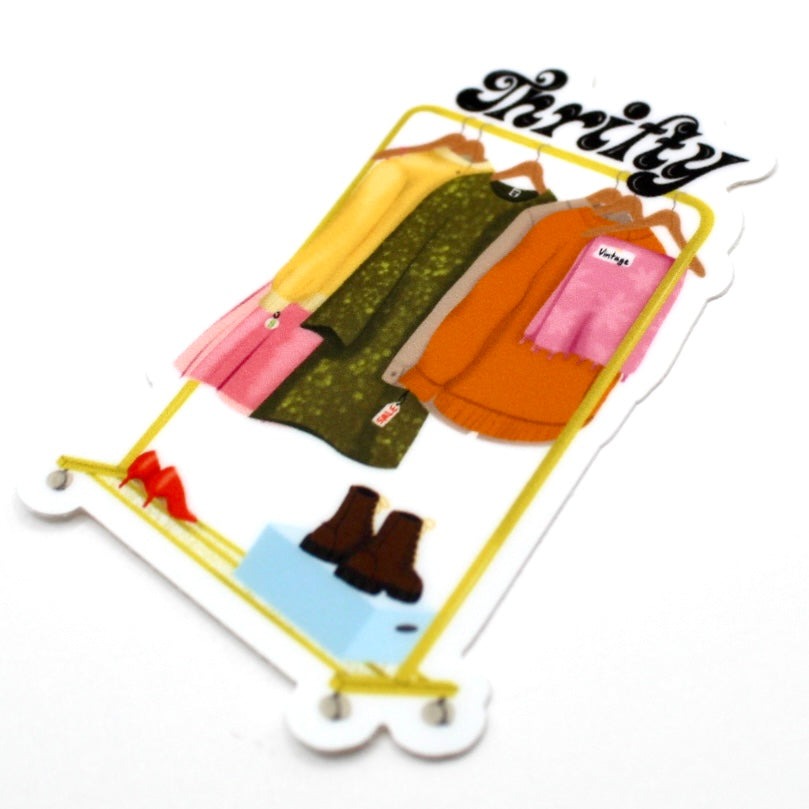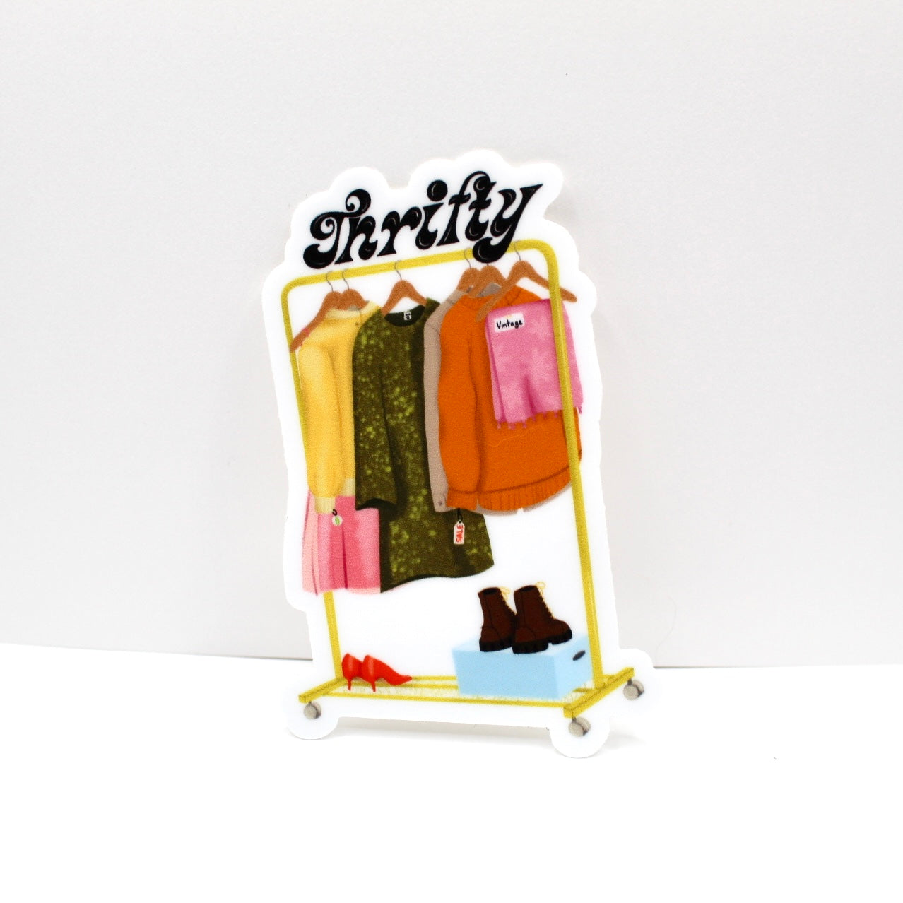 This hand drawn sticker is printed on high quality vinyl, making it waterproof and dishwasher safe! It features bright colors and a simple, clean outline. This sticker has a rack of thrift clothes hanging and says "Thrifty" along the top.
