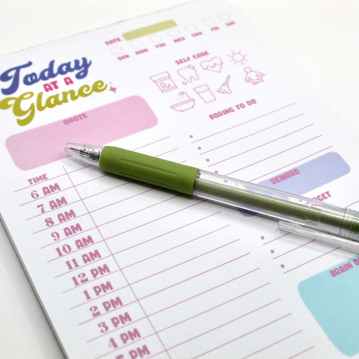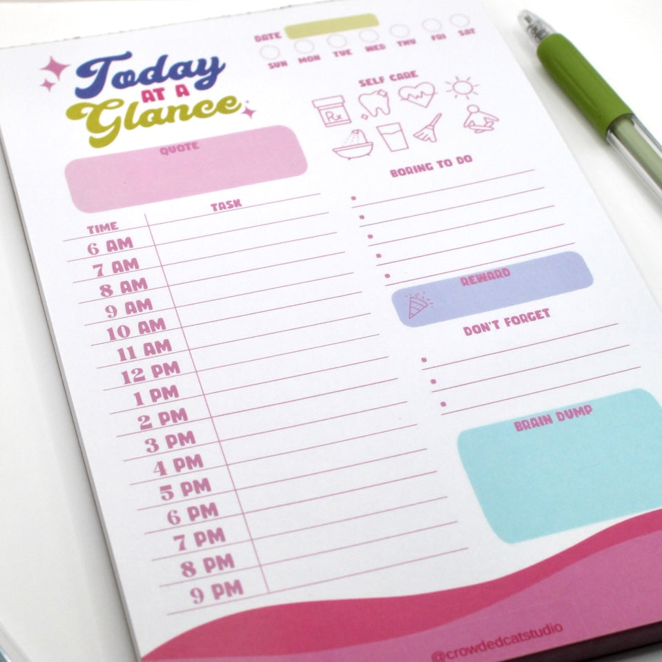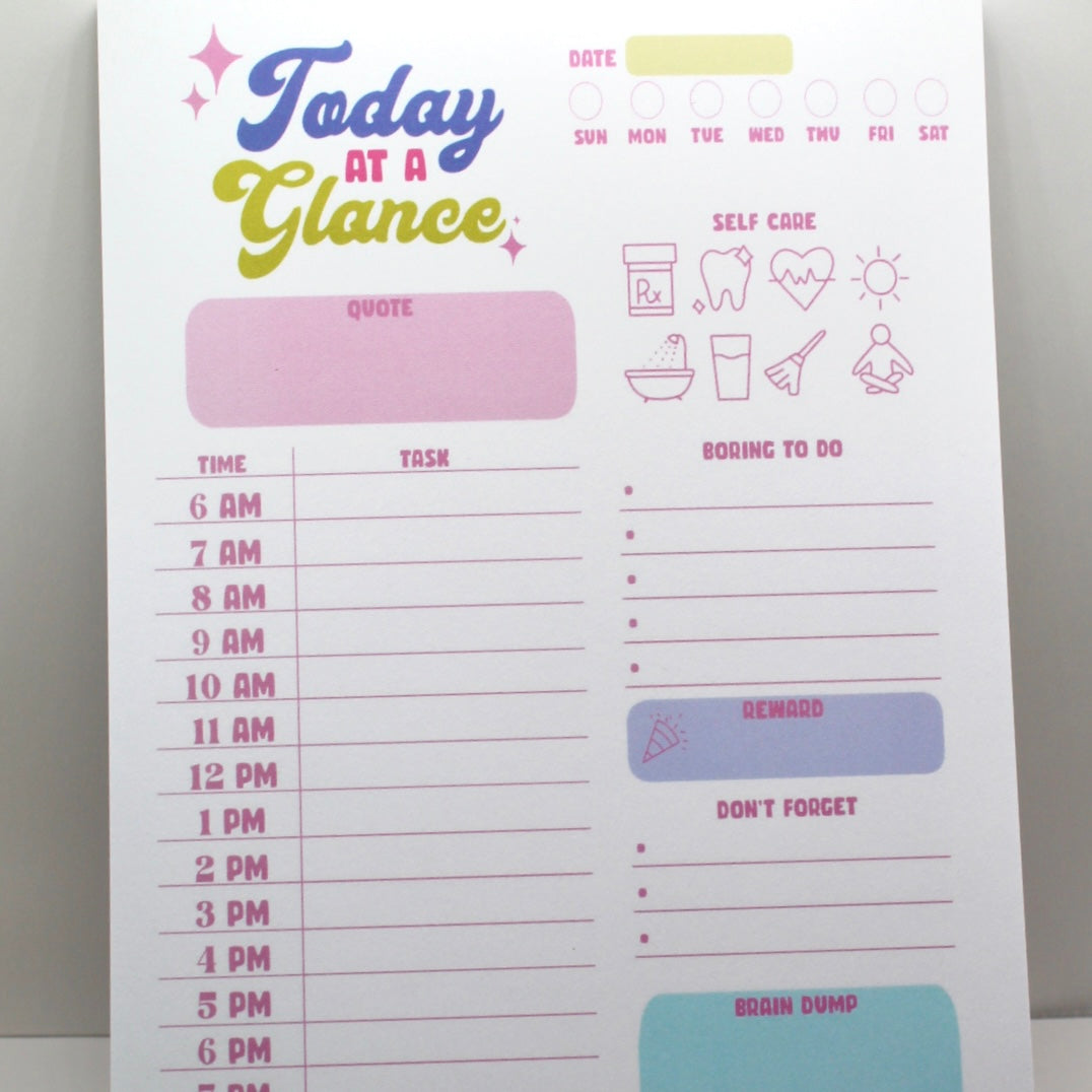 This funky daily planner features bright colors across all 50 identical pages. It has a section for selfcare, tasks, rewards, quotes, and a brain dump. It's the perfect way to organize your day without the commitment of a monthly planner.