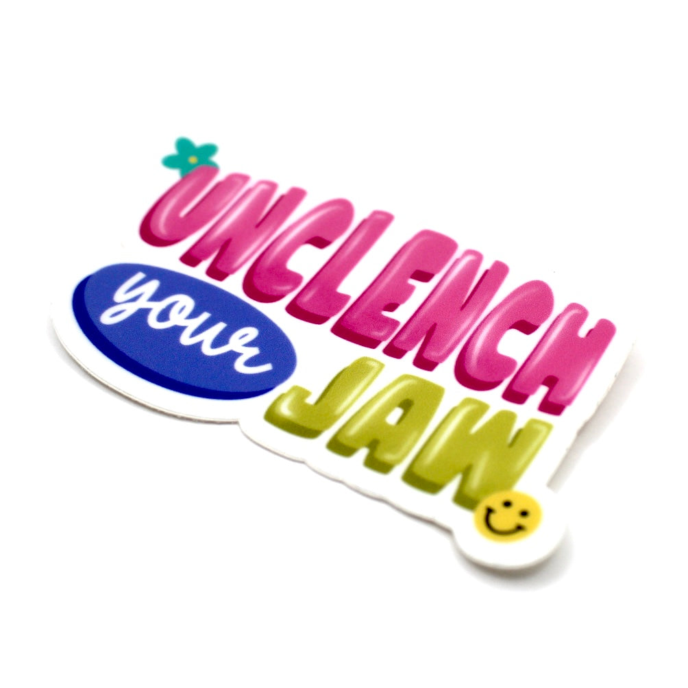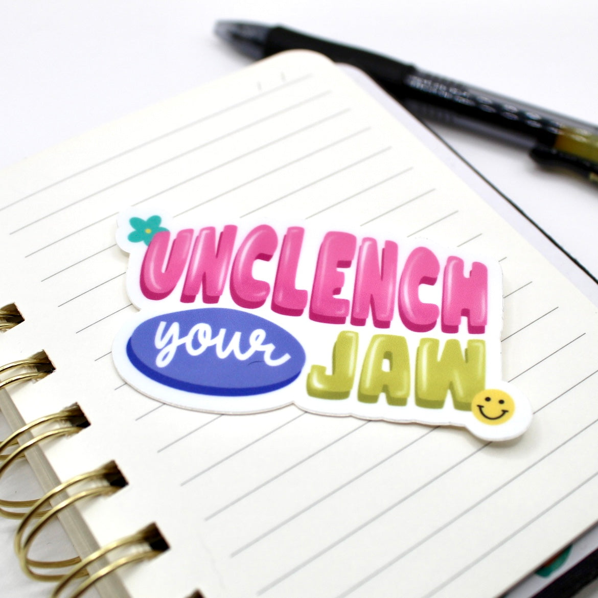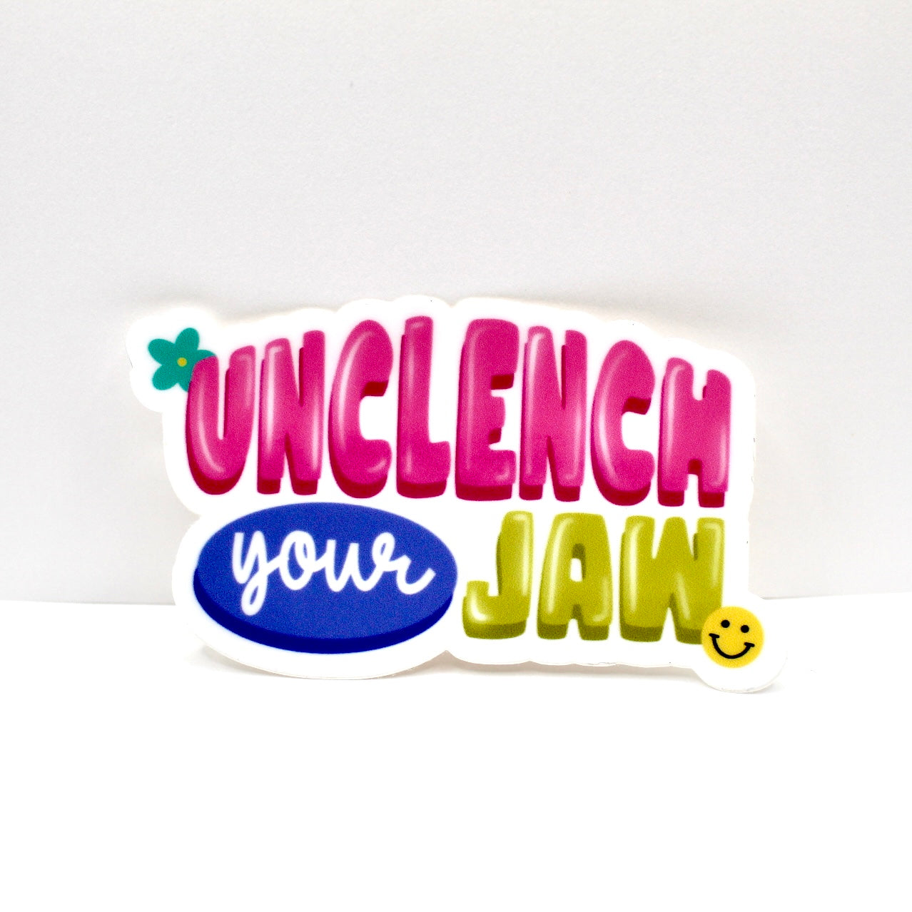 Add flair to daily life with this hand drawn vinyl sticker. With its durable design, its perfect for water bottles, laptops, and so much more! Just apply to any smooth surface. This mental health sticker features a reminder to "Unclench Your Jaw" for those who are anxious.