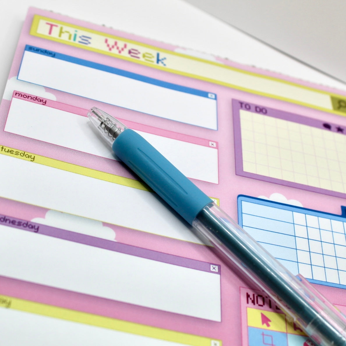 This cute hand drawn planner features bright colors across all 52 identical pages. It has a section for daily planning, habit tracking, to dos, and notes. It has a retro computer inspired design with pop-up like boxes for each day of the week. Text on this notepad is done in 8 bit style.