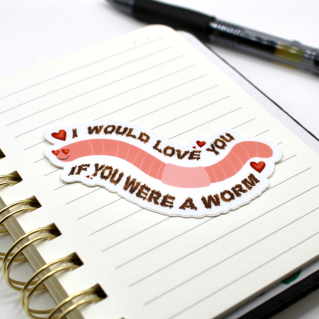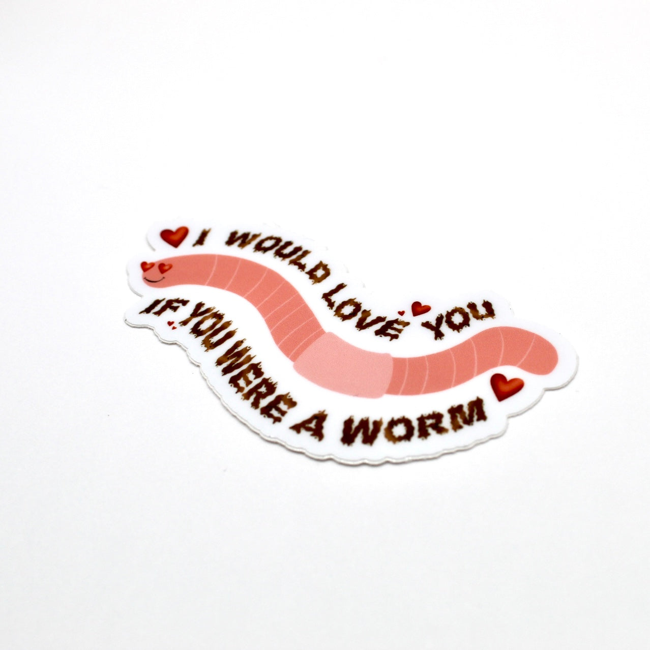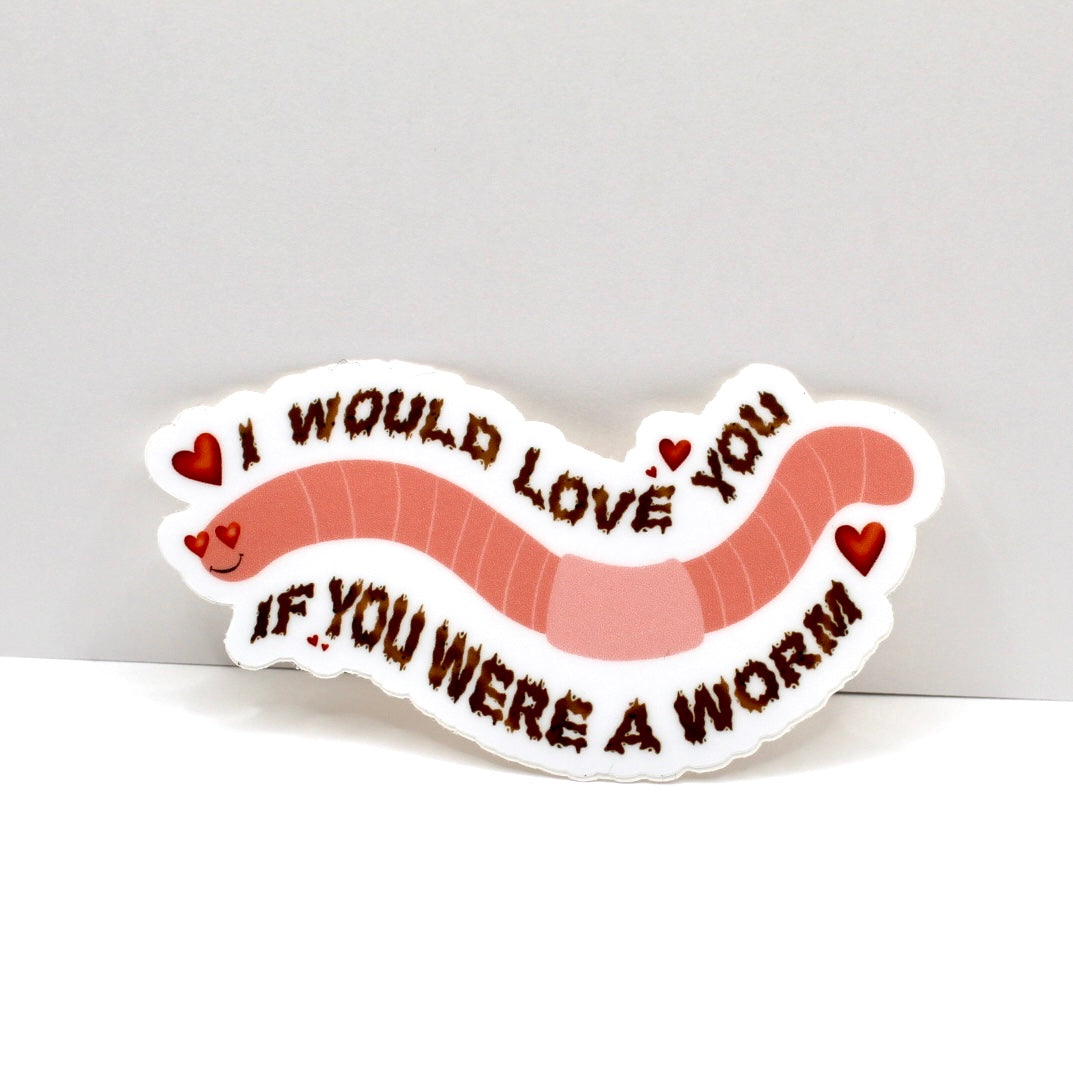 Add flair to daily life with this hand drawn vinyl sticker. With its durable design, its perfect for water bottles, laptops, and so much more! Just apply to any smooth surface. This sticker features a heart eyed worm and says "I would love you if you were a worm".