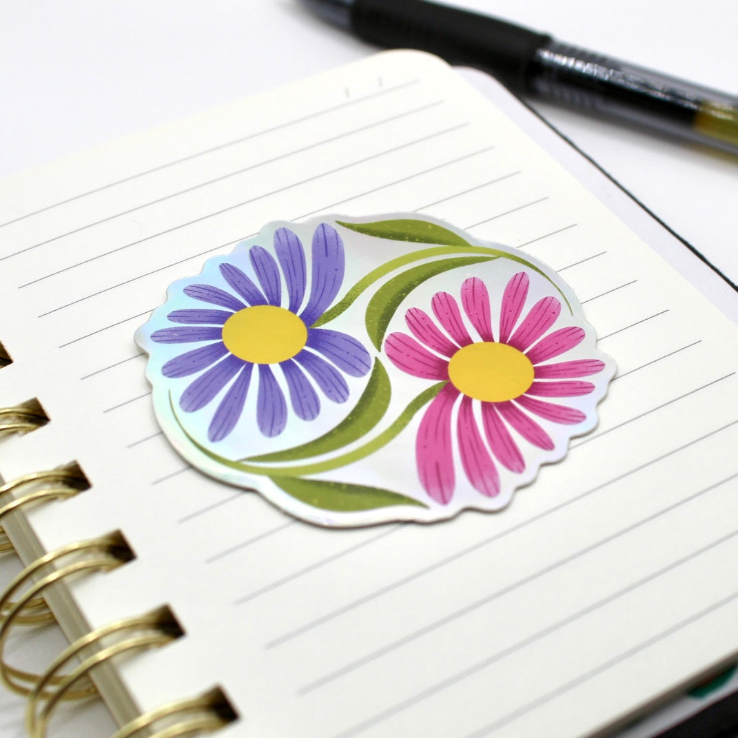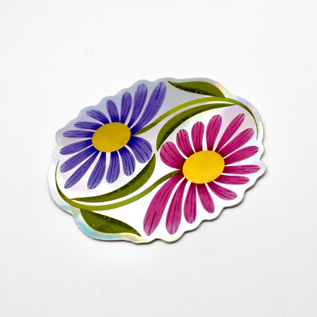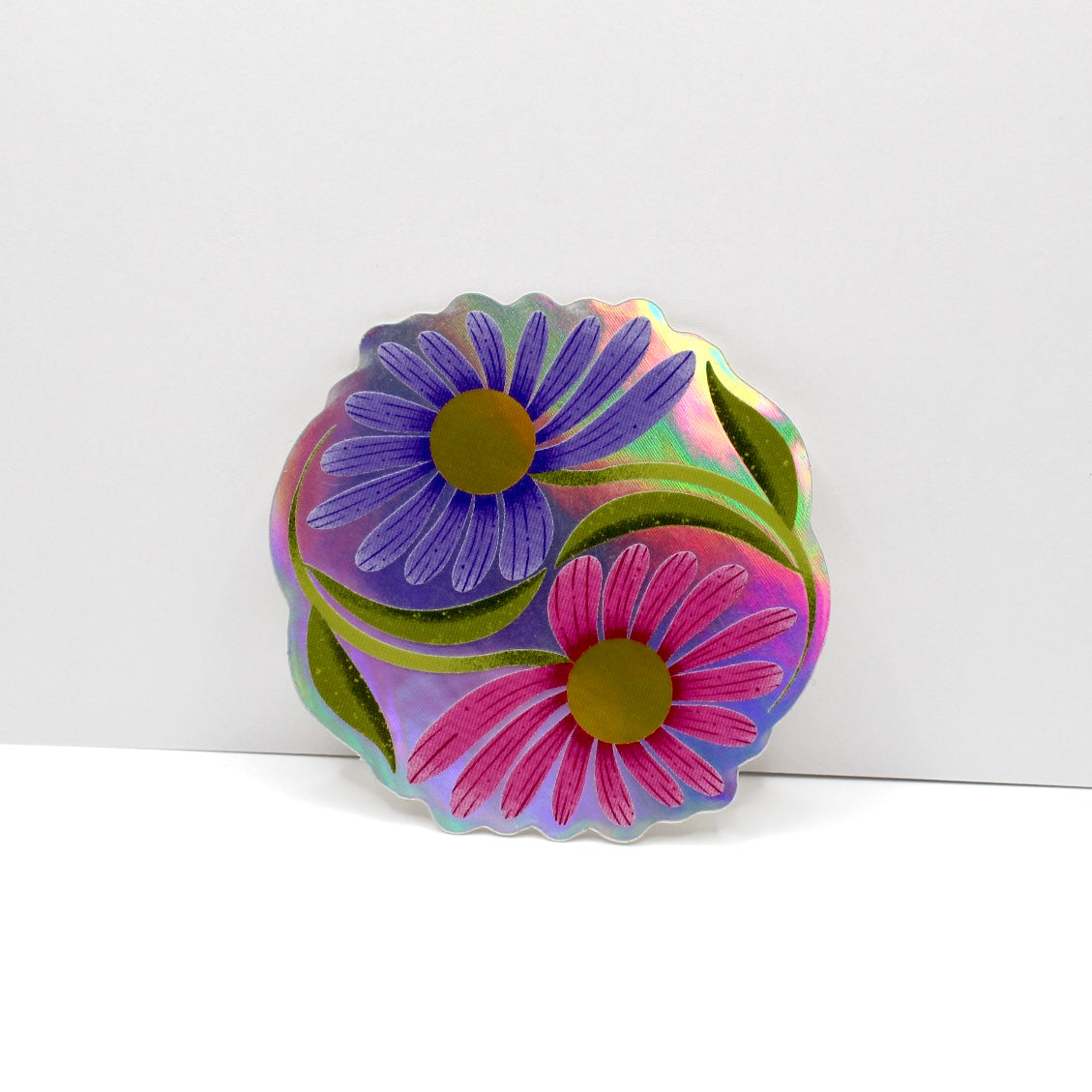 Add flair to daily life with this hand drawn vinyl sticker. With its durable design, its perfect for water bottles, laptops, and so much more! Just apply to any smooth surface. This balanced sticker features a flower yin yang with a holographic background.